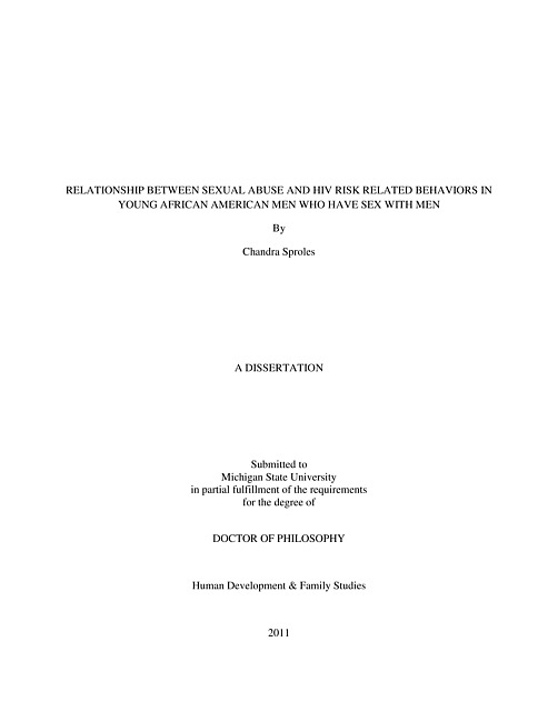 African Americans represent 13% of the United States (US) population, yet they account for almost half of new US HIV/AIDS cases (CDC, 2007a; 2006). In Michigan, although the average HIV prevalence rate for White men is 118 per 100,000, the prevalence rate among African American male residents is 866 per 100,000 persons. Men who have sex with men (MSM) are the predominant risk group among males in Michigan and nationally. HIV is rapidly spreading among this group, particularly among young African Americans. Men who have experienced childhood sexual abuse typically have persistent problems throughout adulthood with sexuality and other issues. Among adult men who have sex with men, the impact of sexual abuse on unsafe sex is well documented. Few studies have examined the prevalence of sexual abuse among young African American men who have sex with men (YAAMSM) and whether it is associated with unsafe sexual behaviors. This study explores the impact of being a victim of sexual abuse on risky sexual behavior among a statewide Michigan sample of YAAMSM. To address the gaps between epidemiologic, psychosocial, and behavioral data on HIV risk among YAAMSM, this study uses data from a comprehensive assessment of YAAMSM between the ages of 13 and 25. The primary goal of this study is to provide formative research on how a history of sexual abuse contributes to risky HIV behaviors such as unprotected sex. Among the 156 YAAMSM in the study, roughly one third (32.1%) reported that they had been sexually abused. The average age of assault was 10 years old, and the main perpetrators were family members and adult strangers. Findings for this study concluded that sexual abuse does not add a layer of risk for higher depressive symptoms, higher alcohol/drug abuse scores or unprotected anal or vaginal sex among young YAAMSM. However, those that reported higher alcohol/drug abuse scores had lower levels of condom use. Also, those with higher depressive scores were more likely to have higher alcohol/drug abuse scores. Through this study, it was also concluded that family support did not mediate the effects of sexual abuse on the depressive symptoms or alcohol/drug abuse scores. However, those that reported higher levels of family support were more likely to report consistent condom use. This study's findings are subject to a few limitations: use of self-reported data, and the lack of measurement of the severity and duration of the reported sexual abuse. Study implications include the need for practitioners and researchers to explore the educational and health promotion interventions that are most effective in reducing risk taking behaviors among sexually abused YAAMSM.