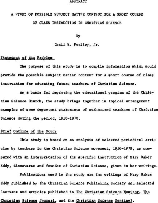 A study of possible subject matter content for a short course of class instruction in Christian Science