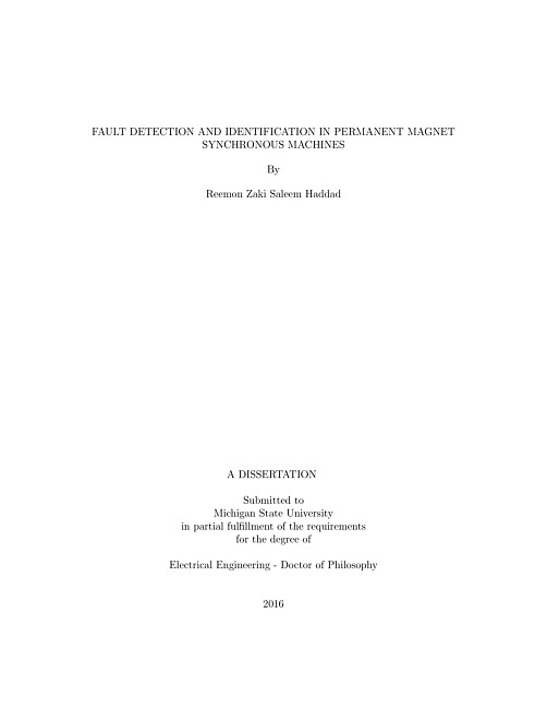 Permanent Magnet Synchronous Machines are subject to a variety of failures in various parts of their structure. These faults cause different and independent changes to the motor parameters and its response behavior. This requires different detection and mitigation methods based on the fault type, location, and severity. Therefore, an effective fault detection and identification method is required, not only to identify if the motor is healthy or faulted, but to detect the fault type, separate it from others, and estimate its severity.In this research, an algorithm is proposed to detect and separate between different faults in Permanent Magnet Synchronous Machines under different operating conditions. The incremental inductance approach is proposed when the motor it at standstill. This method uses the changes in the machine saturation, due to the presence of faults, as a fault indicator. Under steady state operation, the change in the machine commanded voltages is proposedas a fault indicator. However, if the motor is operating at steady state with high torque, the motor current or voltage signature analysis is proposed. The main advantage of the proposed method is that it doesn't require any additional hardware components. The same signals that are used for the controller can be used for fault detection, separation, and estimation. The proposed methods also does not require a complicated signal processing techniques. This makes the proposed methods fast, cost efficient and easy to implement.Three common faults in Permanent Magnet Synchronous Machines are discussed in this work: static eccentricity, partial demagnetization and turn-to-turn short circuit faults. Finite Element Analysis simulations and experimental testes were carried out for three Permanent Magnet Synchronous Machines under healthy and the faulted conditions. The differences between the motors are the winding topology, the input/output power, and the slot/pole combination. The first motor is a 12 poles, 72 slots with a distributed windings, the second motor is a 16 poles, 48 slots with a concentrated windings, the final machine is a 10 poles, 12 slots fractional slots concentrated winding machine. Both simulations and experimental results showed that the proposed methods were able to separate between the different faults with a high level of accuracy.