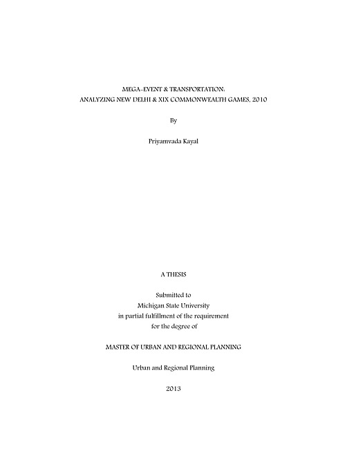 This thesis communicates the affects of a sporting mega event on the urban transportation fabric of a city. It specifically examines the XIX Commonwealth Games 2010 hosted by the capital city of India, New Delhi and analyzes the development process during the preparation period of the Commonwealth Games. It focuses on three types of developments planned and constructed, planned but not constructed and additional developments. The transport infrastructure development like roads and flyover and in transit sector modifications and expansion of the Delhi metro (rapid rail transit) was analyzed according to the above mentioned categories. Finally, it was deduced that the Commonwealth Games accelerated the development process that was initially planned by the city, but it also compelled the city to invest in developments that were required for the successful delivery of Commonwealth Games.