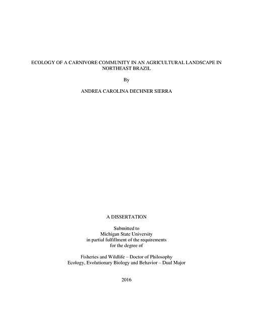 Understanding the factors that affect the presence and distribution of carnivores in human-dominated landscapes is one of the principal goals of conservation ecology. My research sought to determine those factors in a carnivore community inhabiting an agricultural landscape in Bahia, Brazil. To reach this goal I used camera traps and conducted semi-structured interviews in human communities in my study area. The carnivore community studied included eight species of the cat, weasel, raccoon and dog families (puma (Puma concolor), ocelot (Leopardus pardalis), margay (Leopardus wiedii), tayra (Eira barbara), South American coati (Nasua nasua), crab-eating raccoon (Procyon cancrivorus), crab-eating fox (Cerdocyon thous), and domestic dog (Canis familiaris). Results indicated that habitat is a key factor determining the distribution of some species in the carnivore community. Some species, such as the crab-eating fox, had a high probability of using rubber crops and a low probability of using forested areas, whereas others, such as the South American Coati, had a low probability of using rubber crops and a high probability of using forested areas. Analysis at a larger scale indicated that in the case of the crab-eating foxes and the South American coatis landscape-related variables were the best predictors of the animals’ frequency of site use. The frequency of site use by tayras was best predicted by resource-related variables, and for the wildcats (Leopardus spp.) by human-related variables. Results from interviews with stakeholders showed that, the carnivore with the highest frequency of reported negative impacts was the puma due to the fear related to its presence. I also found that the factors that best explained tolerance for pumas were related to personal evaluative attitudes (likability) and perceived benefits. These findings elucidate the complexity of the actions required to propose more appropriate management strategies for carnivore conservation in tropical agricultural systems. The results make an important contribution to our knowledge of why carnivores adapt or fail to adapt to agricultural landscapes with applications for sustainable agriculture within and beyond the Northeast of Brazil.