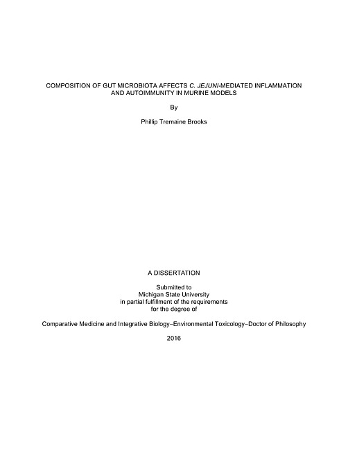 Campylobacter jejuni is the leading antecedent infection to the acute peripheral neuropathy Guillain-Barre Syndrome (GBS). GBS is debilitating, often causes paralysis, and can require several months or more for recovery. Most concerning is that GBS patients are frequently left with long-term neurologic disabilities. Because a vaccine for Campylobacter is lacking there are no viable approaches for preventing this form of GBS. Currently, therapeutic approaches for GBS include plasma exchange and intravenous immunoglobulin but they require specialized equipment, pose significant financial burden, and produce mixed results. These strategies lack a strong rationale because GBS is poorly defined mechanistically. While new working mouse models of GBS may lead to alternative therapies, confirmation of C. jejuni’s specific role in precipitating GBS and the mechanism(s) through which this occurs remain elusive. Thus far, evidence gathered from murine models demonstrates that multiple factors influence C. jejuni pathogenesis, including host genetics and C. jejuni genetics, particularly the genetic plasticity of this pathogen. Notably, the gut microbiota can modulate C. jejuni colonization- and colitis- resistance; however, its role in modulating C. jejuni-triggered autoimmunity remains unknown. The overarching goal of this study is to determine if the composition of gut microbiota affects C. jejuni-triggered autoimmunity in murine models. The chapters of this thesis present the following data addressing this goal; mice infected with antimicrobial resistant Campylobacter strains from Guillain-Barré syndrome patients produced severe colitis and type 2 autoimmune responses when their microbiota were depleted by antibiotics. Furthermore, we demonstrated that transplanted human fecal microbiota alters the immune response to Campylobacter jejuni infection in C57BL/6 mice, potentially increasing the risk of autoimmune sequelae. Finally, comparative genomic analysis of passaged C. jejuni populations revealed genetic variation in multidrug transporter genes cmeB and cmeR in Campylobacter jejuni populations from antibiotic treated mice. CmeR regulates expression of C. jejuni cell surface molecules, again potentially impacting the risk of autoimmune sequelae. Taken together, our results demonstrate that composition of gut microbiota is a critical determinant of inflammatory and autoimmune outcomes in C. jejuni murine models.