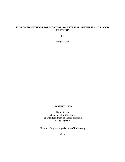 ABSTRACTIMPROVED METHODS FOR MONITORING ARTERIAL STIFFNESS AND BLOOD PRESSUREBy Mingwu GaoCardiovascular diseases are the top 1 natural death cause in the United States. Proactive diagnosis and treatments can significantly reduce patient risk for cardiovascular diseases. Arterial stiffness and blood pressure is recognized as independent predictor of patients’ cardiovascular events. They are probably the most commonly measured indictors of cardiovascular diseases. Arterial stiffness and blood pressure measured in a convenient and accurate manner can provide independent diagnosis information for better patient treatment. Blood pressures measurements have been deployed heavily in the area of hypertensive patient stratification. On the other hand, people use pulse wave velocity as a surrogate measurement of arterial stiffness due to unavailability of arterial stiffness measurement technique. In the past decades, arterial stiffness and pulse wave velocity have been proved to be an independent predictor of cardiovascular events. However, the measurements of blood pressure and arterial stiffness are still inadequate in accuracy, convenience and clinical relevance. This dissertation reported four studies concerning improved methods for monitoring arterial stiffness and blood pressure. The first study proposed an improved technique to monitor arterial stiffness or evaluating Pulse Wave Velocity using arterial tube-load model for robust and accurate arterial stiffness estimation. The second study covers the technique of estimating pulse transit time as a function of blood pressure. This technique can potentially be employed to build calibration curve between pulse transit time and blood pressure using only baseline measure for continuous and cuffless blood pressure monitoring; meanwhile this technique gives a rise of extra pulse transit time correlating with systolic blood pressure which can be potentially useful for patient stratification. The third study investigates two non-invasively pulse transit time measurement techniques as cuffless blood pressure trackers and compare them against invasively measured pulse transit time as reference. The fourth study discusses an evolved technique to build adaptive transform function to estimate central pressure waveform from peripheral blood pressure waveforms. This technique is to improve more clinical significant central blood pressure monitoring based on more accessible peripheral blood pressure waveform. In the end the summary and future work are given for future improvement in arterial stiffness and blood pressure monitoring.