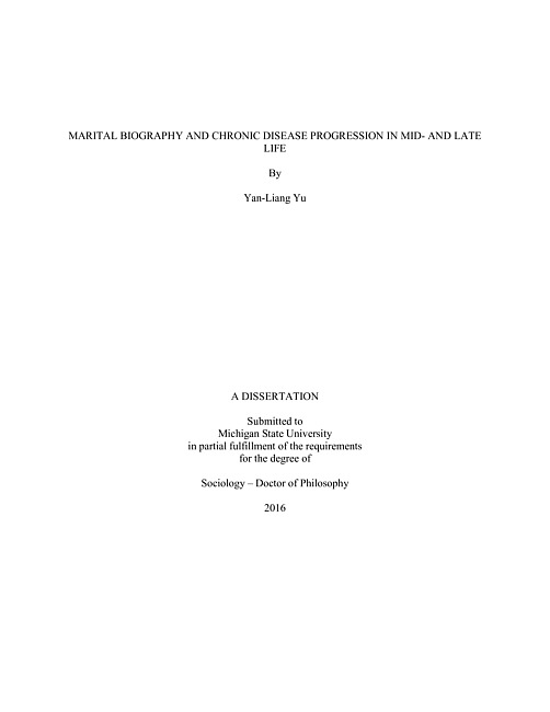 "In light of lengthening life expectancy with chronic disease and increasingly diverse marital experiences over the life course among older adults in the US, this dissertation investigates how marital biography is linked to chronic disease progression among older adults aged 50 years old and over in the US." -- Abstract.