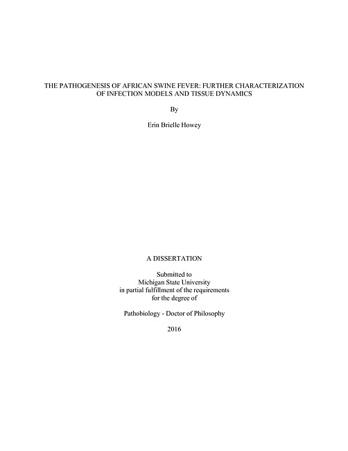 "African swine fever virus (ASFV) causes a reportable and often fatal disease of domestic pigs and wild boars. The current absence of effective prophylaxis or countermeasures makes it a significant agricultural and economic hazard within affected and neighboring regions. Despite extensive ASF research, key elements of the virus-host interaction have yet to be fully explained. Contributing to this knowledge gap is the lack of congruence in infection models amongst investigators. An infection/challenge model that closely simulates natural infection while using precise, measurable inoculation methods, and providing reproducible and quantifiable results is imperative for successful ASFV research and countermeasure development. This dissertation first compares the clinical, viral and shedding dynamics of four modes of infection: Intramuscular (IM), Intranasopharyngeal (INP), Intraoropharyngeal (IOP), and Direct contact (DC), which are commonly used in ASFV investigation. This determines if different inoculation routes/dosages alter the pathogenesis of ASFV in swine and which route most closely resembles natural infection. While developing a standard infection model, a secondary aim of the project was to further clarify the events of infection by detailed characterization of the tissues and cells at different stages of disease. This was investigated in a bipartite approach, both in vivo and in vitro, utilizing virologic and molecular detection methods, as well as immunomicroscopic detection and localization of ASFV antigen alongside cellular markers of interest. Comparison of infection routes revealed that INP simulated natural infection while maintaining reproducibility and ease of control of variables. Examination of an extensive array of postmortem tissue samples revealed low and somewhat route-dictated detection of ASFV at previremic stages of infection, and systemic dissemination of the virus once viremia occurred. Microscopic analysis of tissues indicated that infected cells were distributed within interfollicular regions of lymphoid tissue and the interstitium of non-lymphoid tissue. Immunomicroscpic characterization determined that cells in which ASFV antigen was detected were predominately of monophagocytic origin, with high but variable expression of CD172a, CD163 and lower yet noteworthy expression of CD203a and sialoadhesin. This dissertation presents a comprehensive examination of ASF challenge models, necessary for the prospective standardization of live-animal ASF research. Furthermore, the distinctive characterization of ASFV-infected tissue and cells contribute to the growing understanding of the microenvironment required for the disease. Knowing what tissues and cell types are infected by ASFV can contribute to understanding the molecular or immunologic pathways involved, which viral genes/proteins are necessary for cellular infection. Ultimately this can lead to better targeting of prophylaxis or treatments for ASF."--Pages ii-iii.