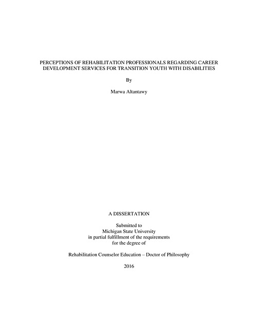 "The purpose of the current study was to gather data potentially useful for developing a better understanding of career development services provided for transition youth with disabilities from the perspective of rehabilitation professionals in the state of Michigan." -- Abstract.