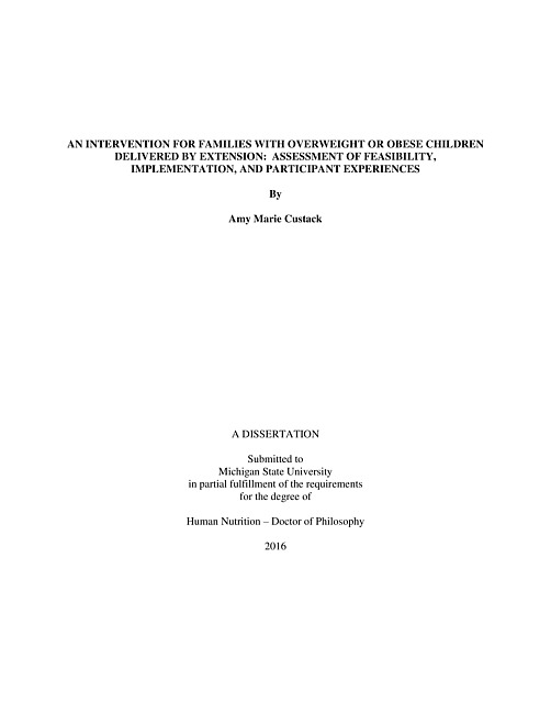 "The current study ... explored the feasibility, implementation challenges, and participant experiences in an intervention, administered through Michigan State University Extension (MSUE), that specifically targets low-income families with overweight and obese children."--page 146.