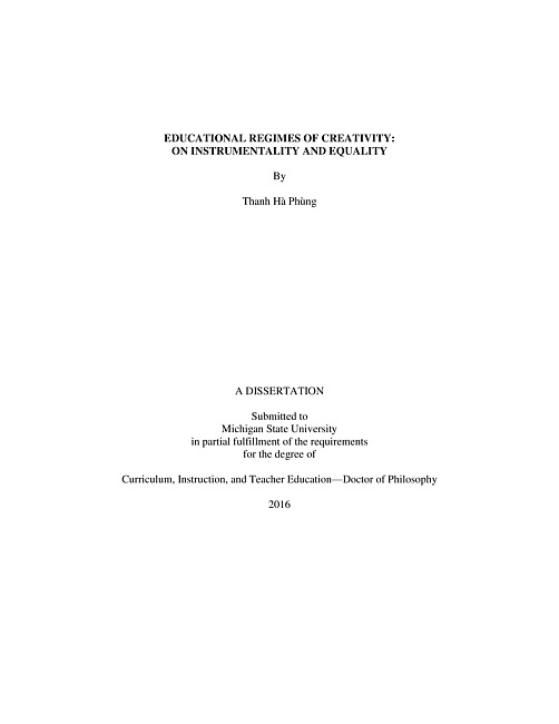 This dissertation, consisting of five independent studies, explores contemporary educational regimes of creativity. In line with Foucault’s theory of governmentality and Rancière’s theory of equality, they analyze educational discourses of creativity to demonstrate their inscriptions of possible subjectivities. Chapter 1 critiques the neoliberal regime of creativity as it is made present through a cross-section of artifacts published in English since 1990s that exhibit a concern for creativity in education and frame their debate in relation to state policies in the United Kingdom, the United States, and China. It describes three rival dispositifs of neoliberal creativity and argues that the neoliberal regime of creativity performs consensus, aligning different worlds and shutting down alternatives. Chapter 2 tells a story of how educational psychology has invented instrumental creativity. It focuses on how the psychometrics and the cognitive psychology of creativity have made creativity an educational problem. Chapter 3 follows the curriculum of extended TRIZ in Việt Nam, a case in which a scientific post-psychological theory of creativity in engineering is adapted into a general theory of creative problem solving and taught to the general public. The chapter portrays curriculum development as a process in which the person in love forms himself as a teacher, integrating into as well as generating the sensible of creativity and education. Chapter 4 inquires into theoretical possibilities of arts education. It critiques the instrumentalism of discipline-based arts education (DBAE) and suggests a non-instrumental way of theorizing art in which what is specific about art is surprisingly not the artist’s act of creation and their well-recognized achievements. Finally, Chapter 5, examining the field of educational philosophy, attends to education as an act of creation. This chapter engages with Levinas, Foucault, and Rancière’s theories of subjectivity and the ways in which forms of subjectification bring something new into the world or grapple with the possibility of the new.