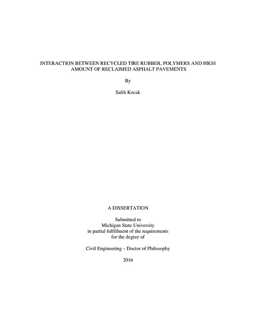"Use of recycled materials has been gaining popularity all over the world to provide a sustainable future for next generations. Crumb Rubber (CR) and Reclaimed Asphalt Pavements (RAP) have been the mostly recycled products in the asphalt industry. Federal and state governments have been searching for alternative methods of either disposing or recycling the large number of waste tires. The use of shredded tire rubber (i.e., crumb rubber - CR) in asphalt pavements is one of the sustainable recycling approaches. Increasing the amount of CR integrated into asphalt pavements reduces various risks involved with stockpiling, burning, damping into landfills and other undesirable disposal methods of scrap tires. Another benefit of using CR is being an alternative for polymer modification. Polymer modification of asphalt binders has gained quite a large popularity in many transportation agencies, primarily due to the superior crack and rut-resistant performance. However, added cost of polymer modification results in an appreciable increase in the initial cost of an asphalt pavement. Use of Recycled Tire Rubber (RTR) is a more economical and sustainable alternative to polymers. Yet, another benefit of CR is the binder softening effect. Addition of RAP in new Hot Mix Asphalt (HMA) construction is a useful practice since it reduces the amount of naturally derived aggregates and virgin binder in the mixture. Increased RAP usage also provides economical savings (e.g., reduced freight cost of the virgin materials) and environmental benefits (e.g., conserves energy that is used while extracting natural aggregates and asphalt cement). Due to the continuous increase in the asphalt binder costs (which is directly related to gasoline costs), utilizing high percentages of RAP (up to 40-50%) is essential for lowering the production costs of asphalt pavements. However, increasing the percentage of RAP in a new asphalt pavement may hinder the economic benefits due to the necessity of expensive softer binders used to compensate for the RAP stiffening effect. Alternatively, this problem may potentially be overcome by use of another recycled material; recycled tire rubber. RTR is known to soften the binder at low/intermediate temperatures, eliminating the need to use soft-expensive binder. Three major contributions of this dissertation can be listed as follows: Interaction between RTR and polymer modified binders have been investigated in terms of performance grading (stiffness), fatigue cracking and rutting.; Interaction between RTR and high volume RAP mixtures has been evaluated in order to eliminate costly soft binders.; Interaction between dry crumb rubber and crumb rubber terminal blend technologies have been studied in order to increase the crumb rubber content without needing expensive plant equipment for crumb rubber wet technology."--Pages ii-iii.