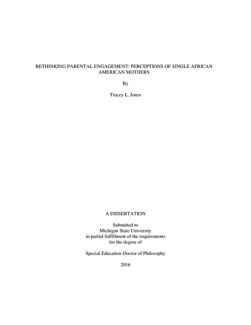 ABSTRACTRETHINKING PARENTAL ENGAGEMENT: PERCEPTIONS OF SINGLE AFRICAN AMERICAN MOTHERSBy Tracey L. JonesFederal law stresses shared accountability between schools and parents for high student achievement. Yet, there is minimal regulation regarding what parental engagement programs must actually look like. As a result many school districts fail to consider nontraditional constructs of parental engagement that honor the available cultural capital, human capital, and social capital of families with divergent structures. ABSTRACTRETHINKING PARENTAL ENGAGEMENT: PERCEPTIONS OF SINGLE AFRICAN AMERICAN MOTHERSBy Tracey L. JonesFederal law stresses shared accountability between schools and parents for high student achievement. Yet, there is minimal regulation regarding what parental engagement programs must actually look like. As a result many school districts fail to consider nontraditional constructs of parental engagement that honor the available cultural capital, human capital, and social capital of families with divergent structures. Marginalized parents are often described as apathetic, unresponsive and uncaring about their children’s education. Female-headed households, in particular, have been linked with poverty, limited English proficiency, decreased supervision, and low educational attainment. While research has established the benefits of parental engagement fewer studies have focused on how single parent families perceive their role in shaping their children’s education. This phenomenological study uses in-depth interviews to explore the phenomena of parental engagement from the perspective of 10 single African American mothers of elementary school age children with or without disabilities. Findings suggest that regardless of education, wealth, and or cultural background parents have an innate desire to help their children succeed academically. Parents’ practices around parental engagement were analogous to Epstein’s framework for six types of engagement that include 1) parenting 2) communicating 3) volunteering 4) learning at home 5) decision making 6) collaborating with the school community. However, practices were distinguished by the parent’s ability to use capitals acquired through socialization rather than through formal learning. This study adds to strengths based narratives that support setting policy and practice that move away from the one-size fit all model of parental engagement.