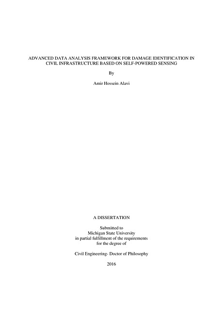 "This interdisciplinary research proposes an advanced data analysis framework for civil infrastructure/structural health monitoring (I/SHM) based on a pioneering self-powered sensing technology. The current work characterizes the performance of a fairly new class of self-powered sensors for specific application problems with complex behavior. The proposed health monitoring systems are established through the integration of statistical, artificial intelligence and finite element methods. Different infrastructure systems with various damage types are analyzed. A new probabilistic artificial intelligence-based damage detection technique is developed that hybridizes genetic programming and logistic regression algorithms. The proposed multi-class classification system assigns probabilities to model scores to detect damage progression. A probabilistic neural network method based on Bayesian theory is further introduced to improve the damage detection accuracy. Data obtained from the finite element simulations and experimental study of hybrid sensor networks is used to calibrate the data interpretation algorithms. The network architecture comprises self-powered sensors that use the electrical energy directly harvested by piezoelectric ceramic Lead Zirconate Titanate (PZT) transducers. The beauty of this so-called self-powered monitoring system is that the operating power for the smart sensors directly comes from the signal being monitored. An advantage of using these sensors is that there is no need to directly measure the absolute value of strain in order to estimate damage. In fact, the proposed self-sustained sensing systems use the sensor output to relate the variation rate of strain distributions to the rate of damage. The proposed data analysis framework consists of multilevel strategies for structural/infrastructure damage identification through: (a) analysis of individual self-powered strain sensors, (b) data fusion in a network of self-powered strain sensors, and (c) data analysis in a hybrid network of self-powered accelerometer and strain sensors. For each of these levels, several damage indicator features are extracted upon the simulation of the compressed data stored in memory chips of the self-powered sensors. A new data fusion concept based on the effect of group of sensors, termed as "group effect", is proposed. The goal is to improve the damage detection performance through spatial measurements over structures. Moreover, combination of the data from a network of accelerometer and strain sensors results in developing an integrated global-local damage detection approach. The investigated cases are crack growth detection in steel plates under a uniaxial tension mode, distortion-induced fatigue cracking in steel bridge girders, continuous health monitoring of pavement systems, failure of simply supported beam under three-point bending, and failure of gusset plate of the I-35W highway bridge in Minneapolis, Minnesota. 3D dynamic finite element models are developed for each of the cases. The experimental studies are carried out on a steel plate subjected to an in-plane tension, a steel plate with bolted connections, and on asphalt concrete specimens in three-point bending mode. PZT-5A ceramic discs and PZT-5H bimorph accelerometers are placed on the surface of the plates to measure the delivered voltage in each damage phase. For the asphalt experiments, a new miniaturized spherical packaging system is designed and tested to protect the PZT ceramic discs embedded inside the specimen. Uncertainty analyses are performed through the contamination of the damage indicator features with different noise levels. The results indicate that the proposed I/SHM systems are efficiently capable of detecting different damage states in spite of high-level noise contamination."--Pages ii-iii.