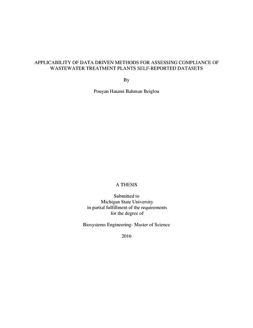 "The primary source of compliance information in water quality monitoring is self-reported data. Despite the heavy reliance on self-reported data in United States environmental regulation, the U.S. General Accounting Office has expressed concerns regarding the potential for fraud in environmental self-reports. Furthermore, recent research indicates that the methods used by state enforcement are unlikely to detect fraud. Therefore, the need for data-driven methods to support regulatory enforcement is an important area of research. In this thesis, we evaluated the applicability of data-driven methods for assessing compliance of wastewater treatment plants (WWTP) self-reported datasets based on a description of the variability in these data streams. For this purpose, first a literature review was conducted (1) to determine the goals of the Clean Water Act programs; (2) identify limitations of current monitoring efforts and data gaps in the understanding of the sources of variability in WWTPs data; and (3) to identify appropriate predictive analytical methods to address the problems. Second, the applicability of Benford's Law as a method for uncovering irregularities in the distribution of first and second digits in a sample dataset was tested and its effectiveness was discussed. Finally, the use of other promising approaches, which may be capable of finding mishandling in wastewater treatment plants are presented with preliminary data."--Page ii.