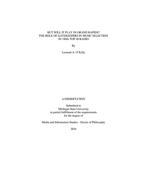 ABSTRACTBUT WILL IT PLAY IN GRAND RAPIDS? THE ROLE OF GATEKEEPERS IN MUSIC SELECTION IN 1960s TOP 40 RADIOByLeonard A. O’KellyThe decision to play (or not to play) certain songs on the radio can have financial ramifications for performers and for radio stations alike in the form of ratings and revenue. This study considers the theory of gatekeeping at the individual level, paired with industry factors such as advertising, music industry promotion, and payola to explain how radio stations determined which songs to play. An analysis of playlists from large-market Top 40 radio stations and small-market stations within the larger stations’ coverage areas from the 1960s will determine the direction of spread of song titles and the time frame for the spread of music, shedding light on how radio program directors (gatekeepers) may have been influenced in their decisions. By comparing this data with national charts, it may also be possible to determine whether or not local stations had any influence over the national trend. The role of industry trade publications such as Billboard and The Gavin Report are considered, and the rise of the broadcast consultant as a gatekeeper is explored. This study will also analyze the discrepancy in song selection with respect to race and gender as compared to national measures of popularity. Interviews with disc jockeys, program directors, and music directors seek to determine exactly what role the individual air personalities had in determining the songs that were played and, as such, what role these specific gatekeepers had in shaping the popular culture of a decade.