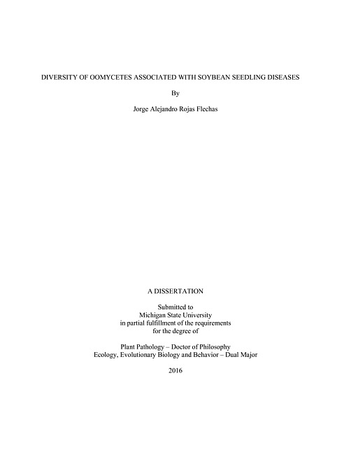 "In the United States, soybeans are produced on 76 million acres of highly productive land, but can be severely impacted by diseases caused by oomycetes. Oomycetes are part of the microbial community that is associated with plant roots and the rhizosphere, which is a dynamic and complex environment subject to the interaction of different microbes and abiotic factors that could affect the outcome of the phytobiome interaction. Depending on environmental and edaphic conditions, some oomycete species will thrive causing root and seedling rot. The identity and distribution of these pathogen species is limited. Therefore, the main questions driving my research are what oomycetes are associated with soybean seedlings and what are the roles of these species causing disease? What factors increase or reduce the impact of these species on the soybean production system? With these questions in mind, the goals of my research are: (1) to characterize the oomycete diversity associated with seedling and root rot diseases of soybean; (2) determine the role of environmental and edaphic factors on the distribution of oomycete species; (3) develop molecular diagnostic tools for Phytophthora sojae and P. sansomeana and (4) evaluate the community structure of the oomycete species associated with soybean root diseases under different conditions. We initially utilized a two-year culture-based survey to study oomycetes associated with soybean seedlings from 11 states in the Midwest, characterizing the communities and profiling phenotypic traits such as pathogenicity and aggressiveness. With this approach, a total of 84 oomycete species were identified and characterized. Of those 84 oomycete species, 43 species 3 had detrimental effects on soybean seedlings being pathogenic and 17 of those pathogenic species also caused disease on soybean seeds. In addition, the ecology of oomycetes was studied by correlating abundance and diversity of oomycetes with different environmental and edaphic parameters. Our main findings were that the community structure of oomycetes (presence/absence) associated with soybean seedlings was similar geographically, but their abundances differed. By using the environmental and edaphic data, it was observed that latitude was correlated with oomycete diversity with increasing diversity observed in samples from higher latitudes. Other parameters such as temperature and precipitation affected community composition within and across years. Soil parameters like pH, clay content and cation exchange capacity also influenced the oomycete community structure. The survey served as a basis to develop markers for diagnostics, providing a collection of Phytophthora sojae isolates, a major soybean pathogen, and at the same time identifying and providing cultures for Phytophthora sansomeana as a threat for soybean. A hierarchical detection system for quantitative PCR and isothermal amplification was developed to identify these pathogens at the genus and species-specific level. Both assays were validated under laboratory and field conditions. Finally, an amplicon-based community analysis was adapted and developed to further investigate and characterize oomycete species and communities associated with agricultural systems. The loci targeted were the ITS of the rDNA, the D1-D3 regions of the 28S and the coxI gene. The data generated from the amplicon-based approach, in conjunction with the phenotype (pathogenicity/virulence) and species distribution, is being used to evaluate the role of climatic, edaphic and biotic factors on the oomycete community structure. Improved understanding of the oomycete community, especially in the root system, and the factors that influence it will enable improved disease management and enhance plant health."--Pages ii-iii.
