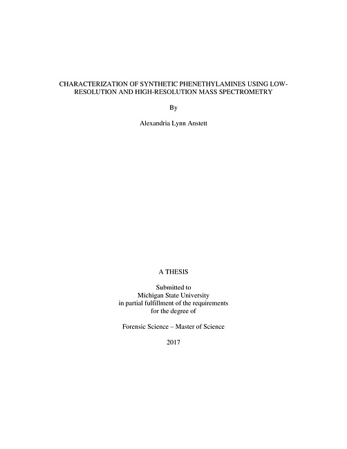 "Definitive identification and differentiation of synthetic designer drugs can be challenging for forensic analysts due to the high structural similarities. The focus in this work was the characterization of synthetic phenethylamines, a common class of designer drugs, using mass spectrometry methods. A set of phenethylamine reference standards was analyzed using both low-resolution and high-resolution mass spectrometry and the mass spectra were probed to identify characteristic and distinguishing features. These features were integrated into a flowchart style characterization scheme for both low-resolution and high-resolution mass spectra. The characterization scheme for low-resolution data utilizes retention index and neutral losses to indicate phenethylamine structural subclass. Further, isotope patterns and characteristic mass spectral features give a preliminary indication of the identity of substituent. This scheme is immediately implementable into forensic practice because it exploits the instrumentation already used for the identification of controlled substances. The high-resolution version of the characterization scheme offers more robust characterization. From high-resolution mass analysis, exact mass and mass accuracy of each ion were determined and mass defect filters were developed. These mass defect filters were successful in characterizing compounds according to structural subclass. Overall, this research provides tools for the characterization of synthetic phenethylamines and highlights the potential for high-resolution mass spectrometry for forensic applications, should this instrumentation become available in forensic laboratories."--Page ii.