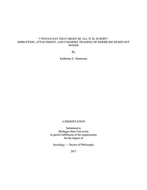 "While herbicide resistance has been an agricultural issue for decades, it is currently getting growing attention from academics, chemical companies, extension educators, and farmers. This is largely the result of weeds' increasing resistance to the popular herbicide glyphosate. Although an Integrated Weed Management approach is recommended to combat herbicide resistance, farmers are hesitant to adopt it and instead continue to express faith in herbicide solutions. Recognizing that society and nature are inseparable causes of this phenomenon, I introduce a sociological perspective to a field dominated by 'hard sciences' in order to clarify why farmers maintain faith in and use of herbicides in the face of increasing herbicide resistance and suggested alternative integrated management practices. In order to do this, I employ a three chapter format. My first chapter focuses on how farmers draw on master frames to understand and make meaning of their reliance on herbicides. This uncovers issues of farmers' false trust in herbicides due to structurally binding conditions. My second chapter draws from place literature to understand herbicide resistant weeds as disruptions of place, arguing that these weeds present an observable challenge to farmers' herbicide dependence that threatens and therefore triggers farmers' place attachment. Together, these chapters describe how farmers understand herbicide resistance and their own reactions to it based on socio-environmental stimuli. Finally, my third chapter focuses on how quality data about farmers can be collected. Drawing from mixed methods, I suggest a framework of relational pragmatism that can be used to more effectively achieve this goal."--Page ii.
