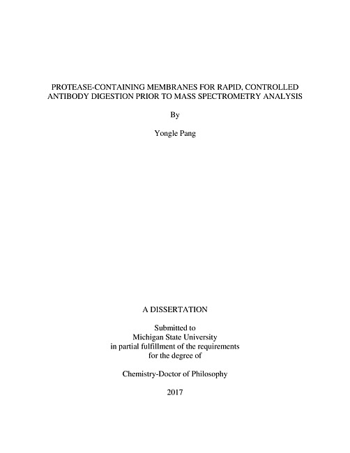 "Monoclonal antibodies are the fastest growing class of therapeutic drugs because of their high specificities to targeQt cells. Facile analysis of therapeutic mAbs and their post-translational modifications (PTMs) is essential for quality control, and mass spectrometry (MS) is the most powerful tool for antibody characterization. Conventional antibody characterization workflows contain an in-solution digestion step, which is labor-intensive and time-consuming. Protease-containing membranes are an attractive alternative platform for protein digestion because of their high local enzyme concentrations, short radial diffusion distances, rapid convection in pores, simple fabrication and low cost. Additionally, variation of protein residence time in the membrane gives control over the size of proteolytic peptides. This research focuses on developing workflows for monoclonal antibody characterization using functionalized porous membranes. Sequential adsorption of poly (styrene sulfonate) and pepsin in a porous nylon membrane forms a pepsin membrane reactor. Pepsin is inexpensive and catalyzes proteolysis in acidic solutions, which avoids the need to alkylate cysteine residues and limits antibody deamidation. Variation of the residence times (3 ms to 3 s) of antibody solutions in pepsin-containing membranes yields "bottom-up" (1-2 kDa) to 'middle-down' (5-15 kDa) peptides in less than 10 min. These peptic peptides cover the entire sequences of Herceptin and a WatersTM antibody. Compared with the performance of bottom-up (in-solution tryptic digestion) and top-down (intact protein fragmentation) analysis of an antibody light chain, middle-down (in-membrane peptic digestion) analysis gives the highest bond cleavage (99%). In-membrane digestion also facilitates detection of PTMs such as oxidation, deamidation, N-terminal pyroglutamic acid formation and glycosylation. Recently developed protease-containing spin membranes provide an excellent platform for rapid, membrane-based protein digestion prior to ultrahigh-resolution Orbitrap MS analysis. Centrifugation of 100-200 æL of pretreated protein solutions through the pepsin- or trypsin-containing membranes takes less than 1 min and gives nearly 100% coverage of the protein sequences in subsequent direct infusion MS analysis of digests of apomyoglobin and four commercial monoclonal antibodies (Herceptin, Avastin, Rituxan and Vectibix). MS analysis of peptic and tryptic peptides also reveals mAb PTMs such as N-terminal pyroglutamate formation, C-terminal Lysine clipping and glycosylation. Liquid chromatography coupled to tandem mass spectrometry analysis of tryptic spin digests and subsequent MaxQuant data searching show 100% sequence coverage of all four antibody light chains, and 75.1%-98.4% coverage of the heavy chains. Compared to in-solution tryptic digestion of mAbs, spin digestion yields higher sequence coverage and a larger number of unique peptides. In-membrane digestion also facilitates protein sequence comparison. Rapid peptic in-membrane digestion of two antibodies with direct infusion MS analysis accurately reveals the antibody modification site in less than 1 h. Overall, membrane-based protein digestion uses minimal sample preparation time and yields high peptide and sequence coverages for identification of protein PTMs."--Page ii-iii.