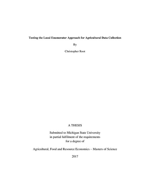 Christopher RootTechnology adoption is widely regarded as critical to agricultural development. However, survey based data on technology adoption is costly to collect. This research is an attempt to lower this cost by using locally based enumerators and tablets. The hypothesis this research tests is that the 'local enumerator approach' will reduce costs while maintaining data quality. This hypothesis is tested by comparing adoption data collected through the local enumerator approach with that collected through a conventional survey in India. Means comparison tests indicate statistically significant differences in adoption estimates derived from the two approaches. Regression analysis, controlling for village fixed effects, covariates and enumerator fixed effects, is used to identify adoption measurement differences between the local and the conventional enumerator approaches. However, none of these analytical approaches are able to eliminate all the differences in adoption estimates, implying significant differences in data quality generated by these two approaches. The study design however was not able to control several potential confounding factors, such as enumerator training method, differences in questionnaire design, and data collection application tools that may have influenced data quality. Although costs are found to be comparable between the two approaches, over the long run, there is potential for costs of local enumerator approach to decrease relative to the conventional approach because of cost efficiencies. However, more effort is needed to ensure data quality before this approach can be considered a cost-effective and a reliable method of data collection in developing countries.