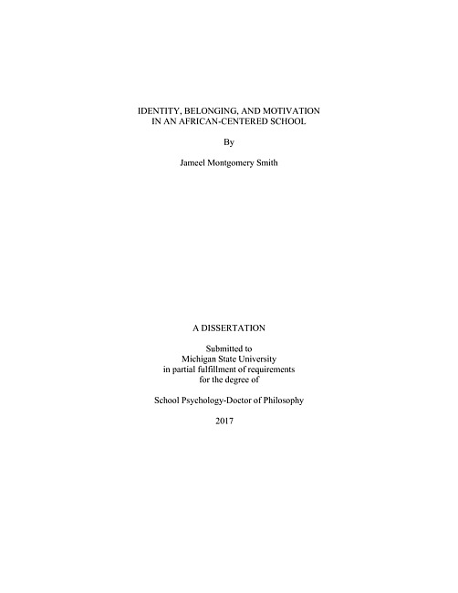 This study examined the racial identity, cultural values and sense of belonging of third through eighth grade students attending an African-Centered school. The study also explored how belonging and motivational goals predicted student learning. The research was based on the racial identity-context congruence perspective (Byrd & Chavous, 2012) and used a mixed methods design. Data were collected using questionnaires, participant observation, and interviews to explore the meaning and practices of an African-centered school. The observations revealed that most of the Nguzo Saba principals, foundational tenants to African-centered learning (Karenga, 1980, were represented in the African-centered school context. Interviews with eighth grade students indicated that they experienced the school as cultivating an African American racial identity, cultural values, and sense of belongingness. Student responses on questionnaires, however, revealed individual differences across all grades, in how students experienced and responded to an African-centered school. Some students indicated patterns of stronger racial identity, mastery orientation, and performance approach orientation while others indicated stronger endorsement of cultural values and belongingness. In comparison to previous research, the students in this study reported higher levels of ethnic identity, cultural values, belongingness, and motivation, suggesting that an African-centered school can improve the schooling experiences of African American students. The existence of disproportional representation of males in school discipline practices and low academic proficiency of most students in the school were unexpected and suggest that improvements are needed. The results of this research have the potential to create supportive learning environments for African American students, particularly for African American males, by expanding the scope of teacher-student relationships, implementing culturally relevant pedagogy, and adopting a holistic school model that fosters ethnic identity, cultural values, and sense of belonging.