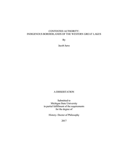"Contested Authority," uses the 1825 Prairie du Chien treaty council as a case study to examine the dynamics of power and authority of an Indigenous borderland located in the eighteenth- and nineteenth-century wild rice lakes and maple sugar forests of the western Great Lakes. This research centers on the interactions and overlapping territorial claims of Dakota and Ojibwe communities that complicated efforts by United States officials to solidify their own claims to the region. The Americans argued that leaders of Great Lakes tribes should delineate their boundaries believing that such boundaries would secure peace between the tribes. American authority in the region was still a weak presence, but American efforts led by Michigan Territorial Governor, Lewis Cass, intended to strengthen the federal government's position in the lands west of Lake Michigan. The ongoing conflict between the Ojibwe and Dakota greatly concerned the Americans as the tribe's sporadic warfare dampened the enthusiasm for settlement and endangered American settlers. Cass' efforts to enforce American ideas of private property conflicted with Ojibwe and Dakota community understandings of environmental resources and property. This research presents the multi-dimensional relationships that made up authority in Ojibwe and Dakota society, explores the efforts of Cass and American agents to disrupt these traditional power structures, and highlights how Indigenous leadership structures persisted despite these American attempts to dismantle them.-- Abstract.