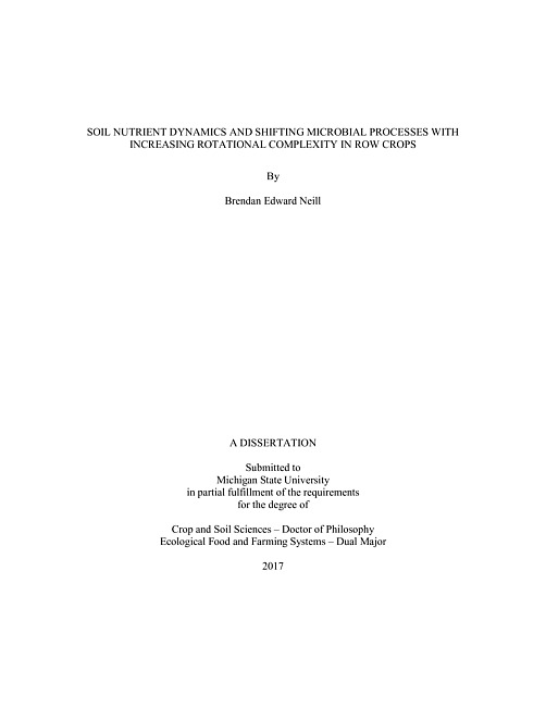 Agriculture faces pressure to supply increased food, fiber, and fuel, while provisioning ecosystem services. Intensive agriculture has contributed to altered global carbon (C) and nitrogen (N) cycles, and is the leading source of nitrous oxide (N2O), a powerful greenhouse gas. New approaches are needed to improve soil nutrient management while sustaining agricultural productivity. In natural systems a strong relationship exists between aboveground diversity and belowground ecosystem controls on nutrients. While increasing the number of crops in rotation in agroecosystems can have multiple benefits, the linkages between rotational diversity, nutrient cycling pathways, and the soil ecosystem remain poorly understood. My dissertation addresses the effects of increasing crop rotational complexity on soil C and N cycles and the soil ecosystem process that regulate them. I extend this work by testing ecosystem-based measures of soil health on Michigan farms.Long term cropping system experiments are ideal sites to examine how rotational legacy shapes belowground processes. Chapters 1, 2, and 3, focus on a cropping biodiversity experiment in place for 10 years at the initiation of my study. The gradient ranges from continuous summer annuals – corn (Zea mays L.) and soybean (Glycine max.) – to rotations that also include a winter annual (wheat; Triticum aestivum L.), to complex rotations with overwintering cover crops. This experiment has not received any external inputs such as fertilizer or pest control agents, so that changes across the gradient are narrowed to the effect of crop rotational complexity. In Chapter 1 I examine how labile C and N pools, soil enzyme activities, and soil respiration respond to increasing rotational complexity. I found that pools of potentially mineralizable C were nearly twice as high on fields with a history of cover crops, compared to those without. Rotations with a legacy of cover crops sustained higher enzyme activities, significantly higher soil respiration and accumulated significantly higher total soil organic matter.In chapter 2, I tested the relationship between increasing the number of crops in rotation and the species diversity of soil bacteria. I found no significant difference in species diversity of bacteria, but a shift in the community between rotations with and without cover crops. Taxa responsible for this shift were mainly from the Acidobacteria and the Proteobacteria which are characterized by contrasting growth and energy use strategies. I focused on denitrification in Chapter 3, a process carried out by soil microbes that produces N2O. Rotations with cover crops had significantly higher mean N2O flux over two growing seasons. Enzyme assays showed that denitrification was more efficient on these rotations, and rotations with cover crops also had a significantly higher proportion of genes in the N2O-production pathway that derived from ammonia oxidizing bacteria.Finally, in Chapter 4 I tested soil health on fields that Michigan farmers had designated as having either good or poor soil quality. Testing captured soil variability on farmer fields, but interviews with farmers revealed caveats to implementing soil health testing. My work on increasing rotational complexity revealed novel microbial controls on soil C cycling and N2O flux, but ultimately implementing practices that enhance soil ecosystem function depends on human decisions about land use, crop production, and environmental outcomes.