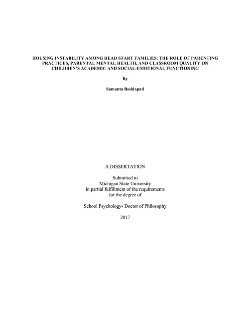 Housing instability among Head Start families : the role of parenting practices, parental mental health, and classroom quality on children's academic and social-emotional functioning