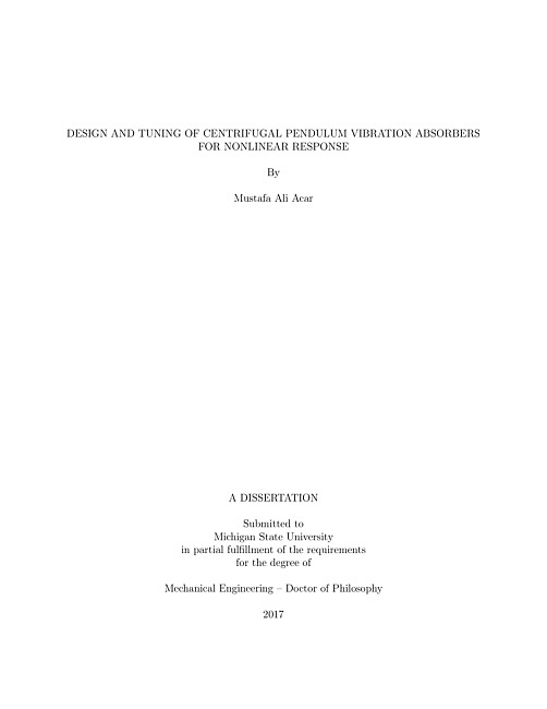 "Centrifugal pendulum vibration absorbers (CPVAs) are used to reduce engine-order torsional vibrations in rotating systems. They are widely used in light aircraft piston engines and helicopter rotors and have recently been introduced for smoothing torsional vibrations in automotive powertrain applications. These absorbers make use of the centrifugal field due to rotation, in place of elastic elements, for their restoring force, so that they are tuned to a particular engine order, rather than a particular frequency, making them ideally suited for these applications. Increasing demands on fuel economy have led to engine downsizing and downspeeding, resulting in harsh torsional excitations being exerted on powertrain components, which are ultimately felt by passengers. In order to maintain durability and NVH performance specifications for these engines, sophisticated vibration control solutions are required, many of which currently involve CPVAs. The contributions made by this study are in three major topics, all related to the design and performance of CPVAs. The first is the development of a new numerical tool for the rapid analysis of the response of complex CPVA systems. This algorithm recasts the equations of motion in a way that significantly extends the applicability and accuracy of the widely known harmonic balance method. This method essentially automates the analysis of steady state responses of systems with multiple CPVAs, including their stability characteristics. This method is much faster than brute-force numerical simulations, and it allows designers to explore the response of systems that are not amenable to more traditional analysis tools, such as perturbation methods. The capabilities of this new tool are demonstrated through two example systems that are known to exhibit rich dynamical characteristics. The second topic is the investigation of a new configuration that uses CPVAs to eliminate crankshaft torsional resonances under order excitation. This dynamical system is a combination of a frequency based element, a shaft torsional vibration mode, and an order based element oscillator, the CPVA. We show that the linear natural frequencies of this system undergo eigenvalue veering as the engine speed is varied near the resonance point. The structure of this veering suggests that with proper tuning of the absorber, one can eliminate the shaft torsional resonance. We use perturbation methods to show that these results extend to operating conditions where the CPVA amplitudes are large and its response becomes nonlinear. The third topic deals with the design and analysis of a new type of kinematic suspension that increases the effective inertia of the absorber, thereby reducing the packaging space for these absorbers. We show that by employing non-symmetric cutouts for the rollers used in standard bifilar (two point) suspensions of CPVAs, we can specify both the rotational and translation motions of the absorber relative to the rotor. This allows designers to increase the effective inertia of the CPVA, thereby providing better vibration correction for a given amount of absorber mass. The dynamical response characteristics for this system are studied using both perturbation methods and the newly developed harmonic balance method. It is shown that this so-called "rocking" absorber configuration provides an improvement of about 15% when compared to its traditional counterpart."--Pages ii-iii.