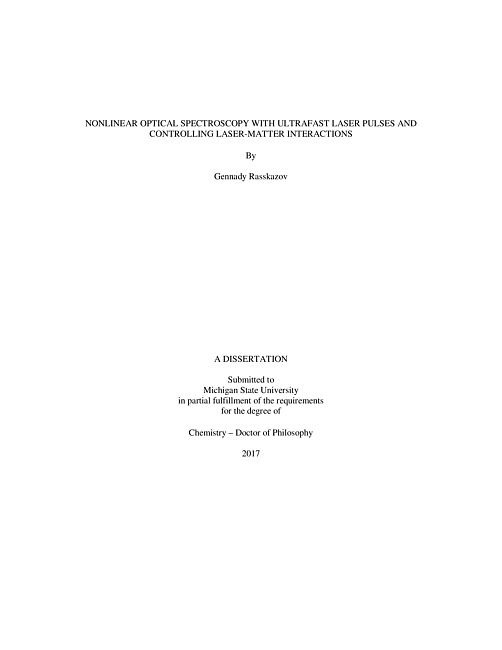 "The goal of my dissertation work was to study nonlinear laser-matter interactions and to obtain a better understanding of the various processes occurring during these interactions. Advances in femtosecond laser technology have become widely adopted in a nonlinear laser spectroscopy and photochemistry. With the extreme temporal and spatial confinements it becomes possible to induce nonlinear responses of the material and to study them with high temporal resolution. The complexity of the medium response to the excitation field necessitates control the excitation process in order to figure out its origin, for example, inter-or intra-molecular dynamics. Therefore, over the last two decades, femtosecond pulse-shaping methods have been developed to reach an unprecedented level of control over the ultrafast laser waveforms where spectral amplitude and phase can be specified in accordance to expected response. The characterization and tailoring of femtosecond pulses was central for my research projects. Experimental results are presented in three chapters. Chapter 2 focuses on two topics: (1) generation of flat top temporal shape pulses with sharp on and off fronts and no loss of spectral bandwidth for particular spectroscopic applications; (2) characterization of noisy ultrafast laser sources, namely, pulse-to-pulse stability, caused by spectral phase or amplitude noise. Chapter 3 presents the fundamentals of Raman spectroscopy and development of a non-contact no-reagents system operating in the eye-safe 1600-1800 nm wavelength range for standoff trace detection of explosives and high-speed imaging, 0.06 ms per pixel. The system used in this project is based on the latest ideas in coherent Raman spectroscopy and technologies to perform selective coherent vibrational excitation of a particular chemical compound with sensitivity of sub-mg/cm2 . Chapter 4 describes time-resolved transition-state spectroscopy of sodium iodide (NaI) by taking advantage of modern lasers and pulse shaping to better map the low-lying electronic states. High-level ab initio multi-reference configuration interaction and density matrix calculations were used to simulate time dependent wave packet dynamics of NaI pumped to the A 0 + state. The results in this dissertation demonstrate the utility of tailored ultrafast laser pulses. Using advanced laser technology and photonic control methods we gain a better understanding of time-resolved dynamics of a chemical reaction and nonlinear spectroscopy. During my work I got to develop new approaches for characterization of the laser source itself and how to tailor it using pulse shaping. The work presented here should serve future studies on nonlinear laser-matter interactions with a novel photonic control schemes."--Pages ii-iii.