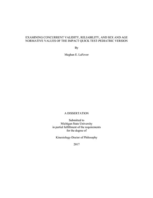 "Purpose: The purpose of this study was to collect normative data, evaluate concurrent validity, and examine reliability for the ImPACT Pediatric and ImPACT Quick Test-Pediatric Version. This study also explored the factors of age and sex for performance differences. Methods: A total of 202 youth athletes, 6 to 11 years of age volunteered to participate in this study. All athletes completed both the ImPACT Pediatric and ImPACT QT-PV during a testing session. The assessments were administered back-to-back, alternately. For the reliability portion of the study, 38 youth were administered the same assessments in a second testing session 1 week following the first testing session. Results: The ImPACT QT-PV constructs were dissimilar to the ImPACT Pediatric constructs, deeming it an invalid youth concussion assessment in its current form. Neither assessment demonstrated acceptable test-retest reliability. Age was found to affect performance scores on the ImPACT Pediatric, however only one difference was found based on sex within the ImPACT Pediatric. Conclusions: Further examination and revision of the ImPACT QT-PV should be conducted before its release for public use. Additionally, the ImPACT Pediatric and ImPACT QT-PV should be investigated for factors leading to instability of measurement over time. Cognitive performance on ImPACT Pediatric revealed an association between increasing age and better performance, however males and females demonstrated little difference in performance scores overall."--Page ii.