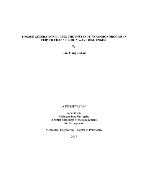 "Worldwide demand for power has been growing exponentially, but its production is causing undeniably negative effects; environmental regulations are changing and becoming stricter. The desire for economical but environmentally friendly engines is focusing on toward alternative methods to produce power. "The Wave Disc Engine" (WDE) is a proposed technology to surpass these requirements. The reduction of mechanical parts in the drive train compared with an IC engine and the use of CNG or any other renewable fuel gas make this WDE an attractive technology to generate power. This new engine concept is a radial rotor in which the typical processes of an Internal Combustion Engine (Compression, Combustion, and Expansion) are realized. Several prototypes were built between 2011 and 2013. For torque production, the unsteady expansion process of outflowing combusted gases is harnessed. This is a new engine concept with incipient research, investigating the mechanism to generate power under unsteady-state conditions. This research work focuses on determining factors that contribute to produce torque in radial rotor channels under unsteady-state conditions. Computational fluid dynamic numerical simulations and analytical method were employed in this investigation. The study initially focuses on the influence of channel parameters (width, height and length); and concludes that channel length and pressure side area all influence torque generation. Both length and pressure side area combine to raise the efficiency and power generated. Because of the unsteady expansion of the gas, an alternative approach was used to evaluate the performance. The Exergetic efficiency produced results for the channel geometry and conditions tested in the range of 31 to 67%. In addition to that, the approach revealed between 82 to 89% of the exergy, initially contained in the channel, still has the potential to be converted into torque in subsequent stages. In addition, a zero dimensional macroscopic approximate balance equation was derived based on the first law of thermodynamics to calculate the unsteady generated work from the unsteady expansion process. Results show prolonging the duration of unsteady expansion process enhances the isentropic extracted work toward the maximum value. In addition to that, the gas expands more efficiently at lower pressure ratios. The impact on the tangential force by the parameters: beta angle, area of influence, and static pressure on pressure and suction sides of a constant cross-section channel, are investigated. The first two parameters change inversely but when combined show similar values at each pressure and suction wall location. Also, most of the generated torque was found in zones near the channel outlet. Furthermore, the torque generation composed of the action of two effects: the change of the angular momentum of the fluid within channel and the outflow rate of the angular momentum at the channel outlet is investigated. These two components are referred as unsteady and steady effects respectively based on the mechanism to produce torque. Results show the torque production benefits when the channel opens quickly. The increase of rotational velocity approximates the quick opening. Unsteady effects produce a significant part of the generated torque and the steady effect can be small at high speed."--Pages ii-iii.