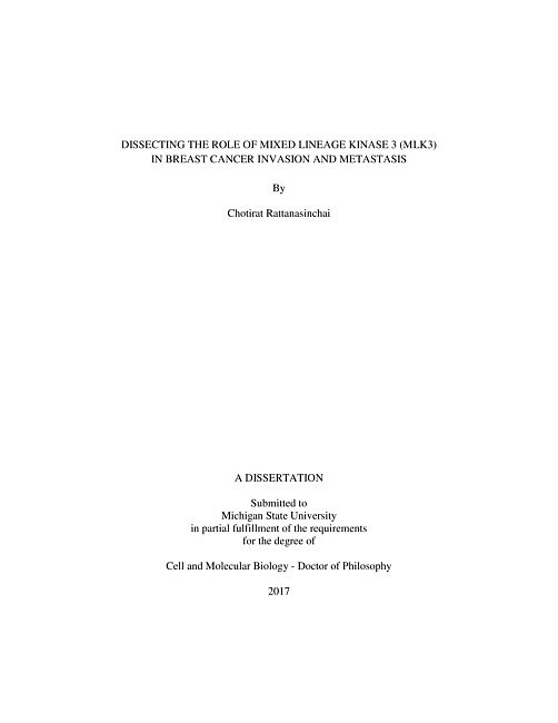 "MLK3 is a mitogen-activated protein kinase kinase kinase (MAP3K) protein which can activate multiple MAPK pathways. MLK3 has been recently shown to be critical for breast cancer metastasis. In this thesis, the mechanisms through which MLK3 signaling controls discrete steps of cancer invasion and metastasis have been investigated. MLK3 was found to regulate the expression of FOS-related antigen-1 (FRA-1), a member of activator protein-1 (AP1) transcription factor family. Overexpression of catalytically active MLK3, but not catalytically inactive MLK3, induced expression of FRA-1, suggesting that MLK3 utilizes its kinase activity rather than scaffolding function to control FRA-1 levels. In addition, MLK3 overexpression was sufficient to drive cancer cell migration in non-invasive, estrogen receptor positive (ER+) breast cancer cells. Conversely, deletion of MLK3 in highly metastatic, triple-negative breast cancer (TNBC) cells decreased FRA-1 expression at both the transcript and protein levels. Similarly, FRA-1 level was reduced upon treatment of TNBC cells with CEP-1347 or URMC-099, two structurally distinct, adenosine triphosphate (ATP)-competitive, MLK inhibitors. These data, together with the findings in ER+ breast cancer cells, indicate that MLK3 kinase activity is required for FRA-1 expression. MLK3 is capable of activating several MAPK pathways. Experiments utilizing small molecule inhibitors targeting specific MAPK pathways identified JNK and ERK pathways as mediators for MLK3-induced FRA-1 expression. FRA-1 is an oncogenic transcription factor controlling a subset of invasion genes. The work described in this thesis demonstrates a role for MLK3 in regulating matrix metalloproteinase (MMP) levels in breast cancer cells. In ER+ breast cancer cells, MLK3 overexpression induced expression of MMP-1 and MMP-9, two well-characterized, FRA-1 target genes. Silencing of FRA-1 in MLK3-overexpressing ER+ breast cancer cells attenuated MMP-1 and MMP-9 expression indicating that FRA-1 is a required intermediary in MLK3- induced MMP regulation. Furthermore, MLK3 deletion or MLK inhibitor treatment was sufficient to decrease both MMP-1 and MMP-9 levels in TNBC cells. MMPs are known to facilitate cancer invasion. Overexpression of MLK3 in ER+ breast cancer cells, which induces both MMP-1 and MMP-9, enhanced the ability of these cells to invade through a thin layer of Matrigel and this invasion was attenuated upon FRA-1 silencing. Moreover, MLK3 deletion or MLK inhibitor treatment also blocked Matrigel invasion of highly invasive TNBC cells. Consistent with a role for MMP-1 in vascular intravasation, deletion of MLK3 which downregulates MMP-1 expression rendered TNBC cells defective in both endothelial permeability and transendothelial migration. Upregulation of FRA-1 and MMP-1 was observed in circulating tumor cells (CTCs) derived from TNBC-bearing mice when compared with parental TNBC cells, further supporting the role of MLK3/ MMP-1 axis in vascular intravasation. High levels of MMP-1 in breast cancer patients are strongly associated with poor prognosis, including increased distant metastases, shortened recurrence, and poorer overall survival. This investigation has deciphered key components of the MLK3 signaling pathways that control the transcription factor FRA-1 and MMP target genes during cancer invasion and intravasation. These studies support the idea that targeting MLK3 is a promising therapeutic strategy for combating TNBC metastasis."--Pages ii-iii.
