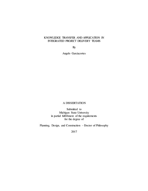 Architectural, Engineering, and Construction (AEC) project teams gather experts from different disciplines and organizations to develop a common project. Promoting knowledge transfer among these experts is vital to effectively integrate their diverse knowledge and optimize project out-comes (i.e., time, cost, and quality). Therefore, AEC teams are progressively adopting project de-livery methods creating knowledge transfer networks involving all key parties (owners, designers, contractors, and subcontractors) early on during the delivery process. However, application of transferred knowledge across disciplines and organizations within these networks is frequently deficient, thus negatively impacting project performance. This dissertation examines the key factors driving knowledge transfer networks in AEC project teams to enable knowledge application and benefit project outcomes. To achieve this aim, this study focuses on AEC project teams contractually implementing the Integrated Project Delivery (IPD) method. This method allows free interactions among key parties since early on during the design phase under shared goals, risks, benefits, and decision-making power. Thus, IPD method allows detecting key factors shaping knowledge transfer networks other than imposed or con-strained knowledge transfer structures. Based on the literature in construction management, organizational science, communication, psy-chology, and social networks domains, a model is developed whereby individuals' knowledge transfer interactions and knowledge application are influenced by their absorptive and articulat-ing capacities, and common knowledge with other peers. To test this model longitudinal data was collected via cross-sectional surveys from an IPD by contract project team with more than 160 team members. The model was analyzed via structural equation modeling and linear regression. Key findings suggest that in IPD teams: (1) Team members occupy network positions where their absorptive capacities enable application of received knowledge; (2) Team members' absorptive capacities can help to identify and understand valuable new knowledge without sharing large portions of common knowledge with senders; (3) Team members with high absorptive capacities can apply received knowledge regardless of senders' articulating capacities; (4) Team members preferably make the effort to properly articulate knowledge to those peers with low absorptive capacity struggling with knowledge application; (5) Knowledge transfer across disciplinary and organizational boundaries improves team members' articulating capacities; and (6) Team members form temporary ad hoc sub-teams gathering the adequate expertise to devise solutions adapted to changing project demands. The study's main contribution to the body of knowledge states that individuals' absorptive ca-pacities and free interactions constitute two key factors to shape knowledge transfer networks facilitating knowledge application in AEC project teams. This expands our understanding about AEC project team integration which is not a mere increase of knowledge transfer interactions across disciplinary and organizational boundaries. In addition, effective team integration involves the degree to which team members can freely move in the knowledge transfer network to take positions where their absorptive capacities enable knowledge application. Therefore, owners aim-ing to optimize AEC project outcomes should include early on during project delivery those key parties whose absorptive capacities in key network positions enable knowledge application.