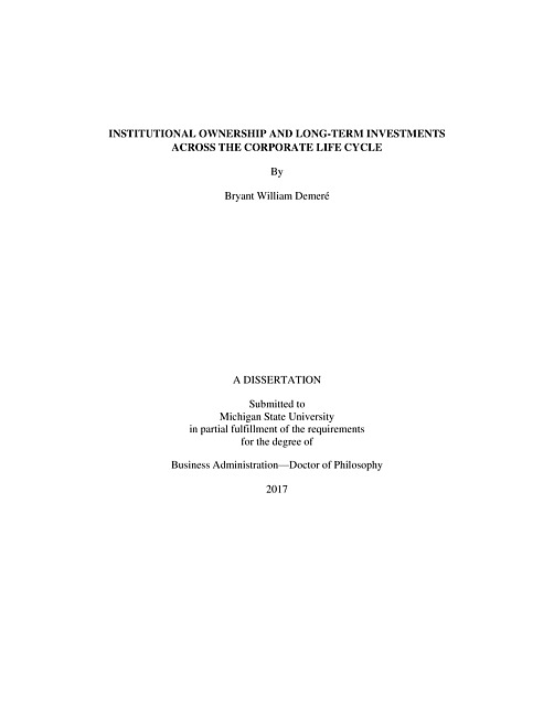 Motivated by concerns about managerial myopia, I examine how the effects of institutional ownership on firms' long-term investments vary across life cycle stages. I find that the effects of institutional ownership on long-term investments in both capital and research and development (R&D) are more positive in transitory life cycle stages relative to sustainable life cycle stages. These results indicate that life cycle patterns explain important variation in the relation between institutional ownership and long-term investments and highlight the importance of firms' life cycles in measuring governance effects. I also find that having a large number of institutional owners with relatively small ownership stakes has a more positive effect than having a smaller number of institutional owners with relatively large ownership stakes. Using the discontinuity between the Russell 1000 and 2000 indexes as an identification strategy, I also provide evidence in support of a causal effect of institutional ownership on firms' long-term investments. Additional tests indicate my results are not driven by firms that are more likely to over-invest.