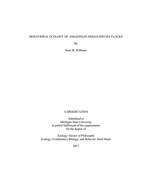 Amazonian mixed-species flocks of birds are remarkable by virtue of their strength of interspecific association. In these flocks, individuals of different species associate with each other for the duration of their lives, i.e. during all daylight hours, 365 days of the year across many years. These obligate relationships provide a unique opportunity to study the behavioral ecology of dependent interspecific relationships. I break my thesis into three chapters. First, I ask whether the relationship between two obligatorily flocking species (nuclear antshrike and antwren species) is symmetrical and whether transient species (non-obligate flocking species) are equally attracted to the nuclear species. Are the transient species equally attracted to the two nuclear species? And are the two nuclear species equally attracted to each other? This first question was necessary to ask before my other questions because I needed to know which species are following other species and which species are being followed. Then, I ask whether the behavior of a single species (the same antshrike species I determined was mostly being followed in the first question) can predict the space use of the whole flock and what environmental and behavioral variables explain the space use. Finally, I ask whether a particular context-dependent vocalization of the antshrike might serve as a mechanism of interspecific cohesion of the flock. After having spent hundreds of hours studying the space use of flocks in order to define the spatial distribution of flocks within their territories, this last question followed naturally since the mechanism of interspecific cohesion was central to the coordination of the movement of the flock through space. In resident Amazonian mixed-species flocks, the pattern of attraction of transient species to nuclear antshrikes and antwrens, and the pattern of heterospecific attraction between the nuclear species, are undocumented. Patterns of attraction can help elucidate the nature of interspecific relationships, i.e. whether they are mutualistic, commensal, or parasitic. We played antshrike and antwren vocalizations to flocks and observed how many transient species approached the playbacks, whether antshrikes and antwrens were attracted to each others' playbacks, and how strongly they responded to the playbacks. More transient species were attracted to antshrike vocalizations than antwren vocalizations and more transient species were attracted to antwren than control vocalizations. Antshrikes and antwrens approached each others' playback significantly more often than they approached control playbacks; antwrens responded significantly more strongly to antshrike vocalizations than antshrikes did to antwren vocalizations. The primary reason transients are attracted to antshrikes may be the reliable alarm calling of the antshrikes, and the primary reason transient species are attracted to antwrens may be that antwrens serve as an indicator of a flock. Finally, antshrikes and antwrens likely confer benefits to each other, but those benefits may not be symmetrical. Investigating the drivers of space use is critical for understanding the ecology of a species. The drivers of space use patterns of multi-species groups have been studied seldom, although many avian species participate in mixed-species flocks throughout the world. We characterized the space use patterns of mixed-species flocks in Amazonian Peru and investigated the drivers of those patterns. We predicted that foraging and anti-predation behavior, i.e. attack rate, vigilance rate, and surrounding vegetation density of the "leader" Dusky-throated Antshrike (Thamnomanes ardesiacus) would explain the space use patterns of the whole flock. We found that low surrounding vegetation density, but not attack rate or vigilance rate, of the Dusky-throated Antshrike (Thamnomanes ardesiacus) explained a substantial amount of the space use patterns of the flock. The results are consistent with the hypothesis that a single species in these mixed-species flocks has a disproportionately large influence on space use decisions. The results may apply to other flocks worldwide that are led by species that behave similarly to the Dusky-throated Antshrike, for example Asian flocks led by drongos (Dicrurusspp.). Cohesion of interspecific associations requires communication among heterospecifics, although the mechanisms of communication are often unexplored. In many monospecific groups, cohesion among individuals is maintained with contact calls given in a certain context. We investigated whether such context-specific calls are responsible for the cohesion of mixed-species flocks of antshrikes and antwrens in Amazonian Peru. Dusky-throated Antshrikes (Thamnomanes ardesiacus) vocalize while in flight, and the number of times they vocalize covaries with the distance of the flight. Antwrens (Myrmotherula spp.) fly toward an antshrike sooner after the flight call than after a randomized control and another common vocalization not associated with flight. In addition, antwrens fly toward an antshrike sooner after a longer series of flight calls than after a shorter series. It remains unclear whether the antshrikes are deliberately signaling the antwrens or the antwrens are eavesdropping on the vocalizations, although signaling is possible since antshrikes may benefit from associating with antwrens through the dilution effect, confusion effect, and the many-eyes effect. The results suggest that the Dusky-throated Antshrike plays a critical role in maintaining Amazonian biodiversity through positive interactions with many species. Future conservation efforts should aim to conserve the Dusky-throated Antshrike, which likely has a disproportionately large positive effect on many avian species.