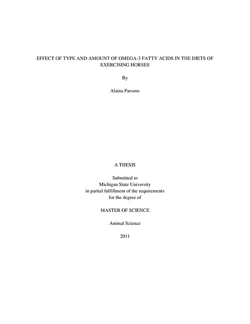 ABSTRACTEFFECTS OF TYPE AND AMOUNT OF OMEGA-3 FATTY ACIDS IN THE DIETS OF EXERCISING HORSESByAlaina Parsons The objective of this study was to determine the effect of the supplementation of differing sources of dietary long-chain polyunsaturated omega-3 fatty acids on health and performance parameters of exercising horses. Twenty-four horses were used in a repeated 3 x 3 Latin square design with 21-d periods. During each period each horse received one of three diets that differed in omega-3 fatty acid profiles: a soybean oil source (SOY), a flaxseed oil source (FLAX), or an algae source (ALG). Horses were exercised 5 d/wk for a minimum of 20 min, with body weights and body condition scores recorded every 7 d, while blood samples, heart rates, and stride lengths were measured on days 0, 21, 42, and 63. Blood samples were analyzed for various inflammatory markers and for a complete plasma fatty acid profile. Heart rates were recorded during a 30-min exercise bout and stride lengths were measured at the walk and trot before and after exercise. No treatment differences were observed for stride lengths, heart rates, total plasma omega-3, omega-6, and docosahexaenoic acid concentrations, or several inflammatory markers measured in plasma and serum. Plasma eicosapentaenoic acid concentrations were higher in horses on the SOY diet (0.45 ± 0.07 percent of total plasma lipid) than horses on FLAX and ALG (P &l 0.05) and plasma α-linolenic acid was altered in response to treatment (P &l 0.05) with horses on FLAX having the greatest percentage. Serum interleukin-10 concentrations were lower in SOY than in ALG (P &l 0.05). The results of this study indicate that mature exercising horses free from osteoarthritis do not exhibit physiological anti-inflammatory benefits when supplemented with a low dose of omega-3 fatty acids over a 21-d period.