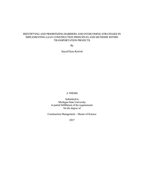 The purpose of this thesis was to prioritize the barriers and the overcoming strategies in implementing Lean Construction within transportation projects in Michigan, United States. Lean Construction was a paradigm shift in thinking, organizational behavior, and working culture that focuses on eliminating waste and maximizing project value. The construction industry, as a significant U.S. gross domestic product contributor, does not experience growth in labor productivity when compared to industries such as manufacturing. In the publicly financed construction of highways, streets and bridges, it was crucially important to ensure that projects are delivered as efficiently as possible. Recent research showed a lack of studies on Lean Construction implementation barriers in the transportation industry within the U.S. An in-depth literature review was performed to identify Lean Construction implementation barriers. The findings of the literature review make the basis for the design of a survey questionnaire used to gather the perceptions of transportation project stakeholders (e.g. owners, constructors, and designers) on implementation barriers and the overcoming strategies to Lean Construction. This study found that a lack of training and mentoring for Lean methods was the greatest barrier within transportation projects in Michigan. Many of the project team members who perform the physical work were unaware of Lean methods and were not often adequately rewarded. To overcome these barriers, this study found that the employees and workers need to be trained in Lean Construction, in order to create a continuous improvement mindset.