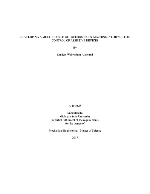 "Assistive devices are revolutionizing the way people with severe motor impairments are able to interact with their environments and perform activities of daily living. Brain-machine interfaces are not well-suited for the changing body and brain of a growing child and therefore we focused our efforts on further developing body-motion interfaces (BoMIs). Current BoMIs are based on principal-component analysis (PCA) and are well-suited for 2D tasks. We extended the PCA position control mode to velocity control mode to enable children to control the positions of the end-effector of a robotic arm. Testing showed that this method was not well-suited for younger children, nor was it easily expandable to higher degrees of freedom. We also developed a novel BoMI technique utilizing a finite element model to produce a virtual representation of the user's body, referred to as the virtual body model. This enables us to project the movements of the subject to a set of distinct anatomical motion patterns. Using natural body motions of the torso and head, the distinct motion patterns are intuitive and easily learned, even when considering numerous degree-of-freedom (DOF) control. The proposed method can take small, inexpensive, wireless sensors and reliably produce accurate pose estimates of the user. The estimates can be interpreted by the software to generate commands for the assistive device. In testing, a user with limited training was able to utilize the interface to control five DOFs of a robotic arm in order to conduct a pick-and-place task as well as to drink from a water bottle."--Page ii.