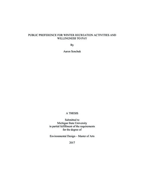 "This thesis studies financial willingness to pay and winter recreation preference among a college population. Data collection was accomplished by having survey respondents broadly identify their preference for winter recreation activities using a collection of 21 winter recreation activity pictures. The pictures used in the data set will seek to represent a diverse range of winter activities that vary in levels of built infrastructure support. In order to reduce bias based on actual income level, separate picture sorts will represent different recreational expenditure allowances, namely $10, $25, and $50 dollars. The results of the Friedman's Analysis of Variance statistical test found that Xr2 = 3.15, rejecting the first research hypothesis that there is a correlation between the winter activities that people prefer and how much they are willing to pay for those activities. When looking at recreation preference using Kendall's Coefficient of Concordance a calculated Xr2 = 48.53. When compared to the tabulated value of 39.99 this showed significant results that regardless of the budget considerations everyone prefers to participate in similar activities. Providing insight on activity selection regardless of budget is performed with the goal of specifying a winter recreation preference baseline from which planners will be able to better design and implement park systems that promote increased access to recreation during winter months."--Page ii.