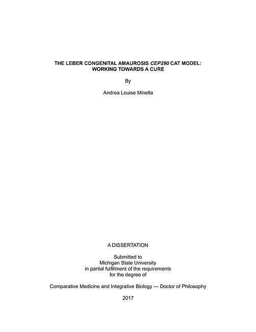 Leber Congenital Amaurosis (LCA) is an early-onset and severe inherited retinaldystrophy. The most commonly implicated gene is the centrosomal 290kDa (CEP290)gene. There are currently no treatments for LCACEP290. Animal models are integral fortreatment safety and efficacy testing, with a feline model for CEP290 retinopathiesshowing promise for this purpose. This model has a spontaneous mutation in CEP290resulting in a progressive retinal degeneration and vision loss. This mutation alterssplicing and is predicted to result in a truncated protein. CEP290 is integrally involved inthe transport within photoreceptor cells, localizing to the interconnecting cilium.The CEP290 mutant cat ("rdAc") has a milder phenotype than the phenotypemost commonly associated with CEP290 mutations in people. Understanding thereason for this milder phenotype was an important aim of this dissertation. We analyzedthe wild-type and truncated mutant transcript levels and total CEP290 protein levels incat retinal tissue across genotypes (wild-type, heterozygous, homozygous mutant). Ourfindings show that the milder phenotype in mutant cats is likely the result of low-levelproduction of wild-type transcript and protein combined with production of truncatedprotein that we suspect retains some function. These measures can also serve asobjective markers of disease progression or treatment success in future studies.Further objective markers were investigated utilizing spectral-domain opticalcoherence tomography. By analyzing photoreceptor layer thickness (receptor plus/REC+) and the ellipsoid zone (EZ), a zone noted to change with disease in people, weshowed that REC+ thickness and EZ integrity can be used as markers of diseaseprogression. These findings support the cat as a CEP290 model, and show the affectedcats have a degeneration with central retinal sparing as described in human patients.We also developed an in vitro tool by developing primary fibroblast cell culturesfrom skin samples of CEP290 cats. We showed that cilia formation, which involvesCEP290, can be induced, opening the door for future cilia studies. We assessed cilialength as an objective marker of disease, however, no difference was found in cilialength across genotypes. Utilizing this new tool, we tested a CRISPR/Cas-9 genomeediting treatment in an attempt to replace the mutated region with a sequence thatwould direct splicing to the correct location. We achieved high efficiency transduction ofCRISPR components, however, we failed to detect insertion of our chosen sequence.As we work towards a treatment, it is imperative to develop an optimized methodto deliver the treatment to feline photoreceptors. To achieve this aim we tested hybridadeno-associated viral (AAV) vectors, the retinal viral vector of choice, in the wild-typefeline retina. We showed that all serotypes studied, AAV2/2, 2/5, 2/8, and 2/9, transducephotoreceptor cells with AAV2/8 and 2/9 showing higher transduction and faster onset.Interestingly, we found more efficient transduction of cones than rods, an unusualfinding that speaks to the need to use caution when extrapolating across species.It is our hope that these data will help the scientific community move closer totreatments for CEP290 retinopathies. We have added to the understanding of the rdAccat model and determined objective markers, supported the cat as a model, and havemade progress towards a treatment.