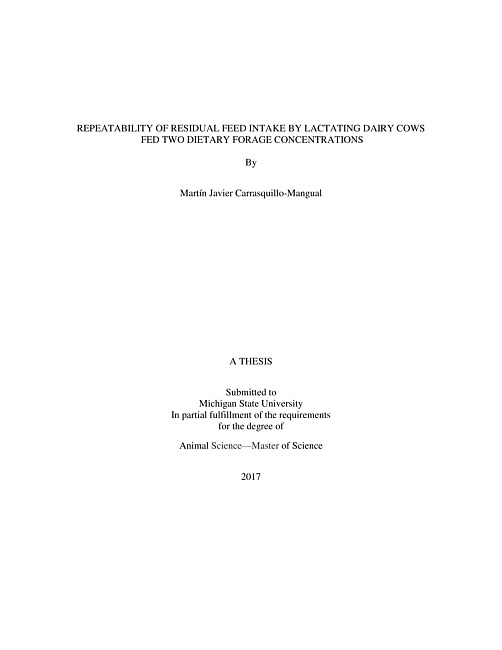 "A total of 84 Holstein cows in mid-lactation were studied in three experiments. The study was a crossover design with 2 treatment periods. Treatments were a high forage-low starch diet (HF; 36%NDF, 19% starch) and a low forage-high starch diet (LF; 26%NDF, 32% starch). Forage comprised 70% of the DM in HF and 47% in LF. Collected data included: dry matter intake (DMI), milk yield (MY), body weight (BW), body condition score (BCS), and milk components. Statistical analysis was performed using the MIXED or GLM procedures (SAS 9.4). An RFI value was calculated for each cow when fed each treatment diet then, cows were ranked as high RFI (HRFI), medium RFI (MRFI) or low RFI (LRFI) for each treatment diet. The HF diet resulted in a decrease of 10% DMI, 5% ECM and 1% BW compared to the LF diet. Rate of BW accretion was 60% lower for cows fed HF compared to for cows fed LF. Milk fat yield, and BCS were not altered by treatments. RFI was relatively repeatable (r=0.54) across the two diets. Of all animals, 56% maintained their group ranking across treatments whereas 38% changed ranking by 1 group. Only 6% moved in ranking from the HRFI to the LRFI group or vice versa. In conclusion, although dietary treatments significantly altered intake, milk production, and energy partitioning, RFI was relatively repeatable for cows fed two diets with different forage concentrations. Thus, genomic breeding values of RFI estimated from cows fed a lower forage (higher starch) diet should still be useful when they are fed a higher forage diet containing less starch."--Page ii.