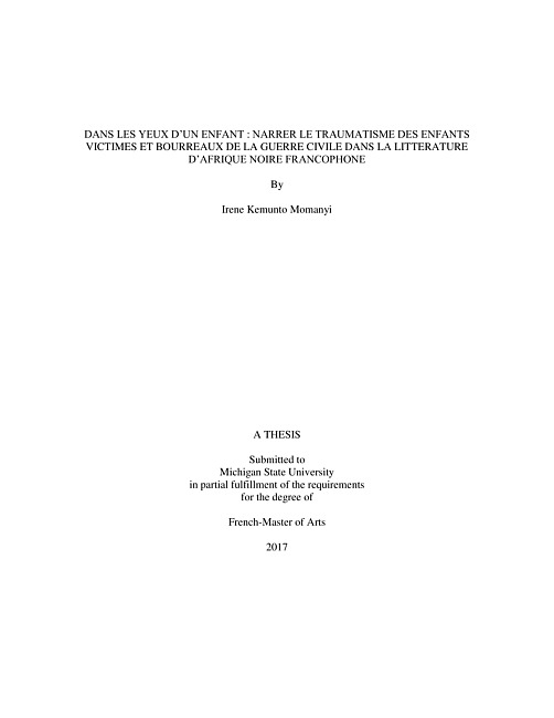 Civil wars have become a common phenomenon in many African nations. Children are vulnerable and so become the most affected. The trauma caused by civil wars on children is long-term. This thesis analyzes the narration of trauma by child victims and perpetrators of civil war in black Francophone Africa. The analysis is done through two fiction novels: Ahmadou Kourouma's Allah n'est pas obligé (2002) and Emmanuel Dongala's Johnny chien méchant (2000). In both novels, the narrators are children and their narration brings into light important facts about civil wars in Africa particularly how they affect children. The first part of this thesis is dedicated to explaining civil war phenomenon as narrated by children and linking information provided by narrators with historical truths. The second part discusses children's narratives on trauma imposed by war and how this narration of trauma can be reparative to the narrators. This thesis concludes showing a new perspective that child narrators bring to the global narratives on civil wars –that of a child, a forgotten and often overlooked perspective. Children are the cradle of humanity and so the importance of this perspective cannot be overstated.