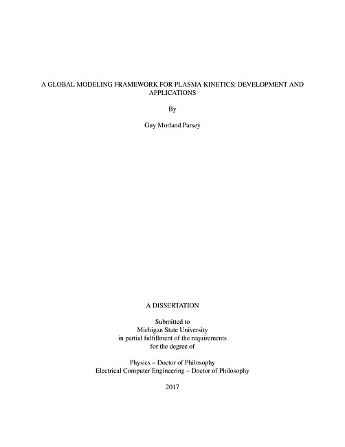 The modern study of plasmas, and applications thereof, has developed synchronously with com-puter capabilities since the mid-1950s. Complexities inherent to these charged-particle, many-body, systems have resulted in the development of multiple simulation methods (particle-in-cell,fluid, global modeling, etc.) in order to both explain observed phenomena and predict outcomesof plasma applications. Recognizing that different algorithms are chosen to best address specifictopics of interest, this thesis centers around the development of an open-source global model frame-work for the focused study of non-equilibrium plasma kinetics. After verification and validationof the framework, it was used to study two physical phenomena: plasma-assisted combustion andthe recently proposed optically-pumped rare gas metastable laser.Global models permeate chemistry and plasma science, relying on spatial averaging to focusattention on the dynamics of reaction networks. Defined by a set of species continuity and energyconservation equations, the required data and constructed systems are conceptually similar acrossmost applications, providing a light platform for exploratory and result-search parameter scan-ning. Unfortunately, it is common practice for custom code to be developed for each application-an enormous duplication of effort which negatively affects the quality of the software produced.Presented herein, the Python-based Kinetic Global Modeling framework (KGMf) was designed tosupport all modeling phases: collection and analysis of reaction data, construction of an exportablesystem of model ODEs, and a platform for interactive evaluation and post-processing analysis. Asymbolic ODE system is constructed for interactive manipulation and generation of a Jacobian,both of which are compiled as operation-optimized C-code.Plasma-assisted combustion and ignition (PAC/PAI) embody the modernization of burning fuelby opening up new avenues of control and optimization. With applications ranging from engineefficiency and pollution control to stabilized operation of scramjet technology in hypersonic flows,developing an understanding of the underlying plasma chemistry is of the utmost importance.While the use of equilibrium (thermal) plasmas in the combustion process extends back to the ad-vent of the spark-ignition engine, works from the last few decades have demonstrated fundamentaldifferences between PAC and classical combustion theory. The KGMf is applied to nanosecond-discharge systems in order to analyze the effects of electron energy distribution assumptions onreaction kinetics and highlight the usefulness of 0D modeling in systems defined by coupled andcomplex physics.With fundamentally different principles involved, the concept of optically-pumped rare gasmetastable lasing (RGL) presents a novel opportunity for scalable high-powered lasers by takingadvantage of similarities in the electronic structure of elements while traversing the periodic ta-ble. Building from the proven concept of diode-pumped alkali vapor lasers (DPAL), RGL systemsdemonstrate remarkably similar spectral characteristics without problems associated with heatedcaustic vapors. First introduced in 2012, numerical studies on the latent kinetics remain immature.This work couples an analytic model developed for DPAL with KGMf plasma chemistry to bet-ter understand the interaction of a non-equilibrium plasma with the induced laser processes anddetermine if optical pumping could be avoided through careful discharge selection.