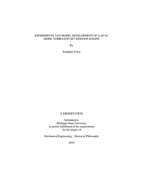 "The number of vehicles powered by a source of energy other than traditional petroleum fuels will increase as time passes. However, based on current predictions, vehicles run on liquid fuels will be the major source of transportation for decades to come. Advanced combustion technologies can improve fuel economy of internal combustion (IC) engines and reduce exhaust emissions. The Dual Mode, Turbulent Jet Ignition (DM-TJI) system is an advanced, distributed combustion technology which can achieve high diesel-like thermal efficiencies at medium to high loads and potentially exceed diesel efficiencies at low-load operating conditions. The DM-TJI strategy extends the mixture flammability limits by igniting lean and/or highly dilute mixtures, leading to low-temperature combustion (LTC) modes in spark ignition (SI) engines. A novel, reduced order, and physics-based model was developed to predict the behavior of a DM-TJI engine with a pre-chamber air valve assembly. The engine model developed was calibrated based on experimental data from a Prototype II DM-TJI engine. This engine was designed, built, and tested at the MSU Energy and Automotive Research Laboratory (EARL). A predictive, generalized model was introduced to obtain a complete engine fuel map for the DM-TJI engine. The engine fuel map was generated in a four-cylinder boosted configuration under highly dilute conditions, up to 40% external exhaust gas recirculation (EGR). A vehicle simulation was then performed to further explore fuel economy gains using the fuel map generated for the DM-TJI engine. The DM-TJI engine was embodied in an industry-based vehicle to examine the behavior of the engine over the U.S. Environmental Protection Agency (EPA) driving schedules. The results obtained from the drive cycle analysis of the DM-TJI engine in an industry-based vehicle were compared to the results of the same vehicle with its original engine. The vehicle equipped with the DM-TJI system was observed to benefit from 103033% improvement in fuel economy and 103031% reduction in CO2 emission over the EPA combined city/high driving schedules. Potential improvements were discussed, as these results of the drive cycle analysis are the first-ever reported results for a DM-TJI engine embodied in an industry-based vehicle. The resulting fuel economy and CO2 emission were used to conduct a cost-benefit analysis of a DM-TJI engine. The cost-benefit analysis followed the economic and key inputs used by the U.S. EPA in a Proposed Determination prepared by that agency. The outcomes of the cost-benefit analysis for the vehicle equipped with the DM-TJI system were reported in comparison with the same vehicle with its base engine. The extra costs of a DM-TJI engine were observed to be compensated over the first three years of the vehicle's life time. The results projected maximum savings of approximately 2400 in 2019 dollars. This includes the lifetime-discounted present value of the net benefits of the DM-TJI technology, compared to the base engine examined. In this dollar saving estimate, the societal effects of CO2 emission were calculated based on values by the interagency working group (IWG) at 3% discount rate."--Pages ii-iii.