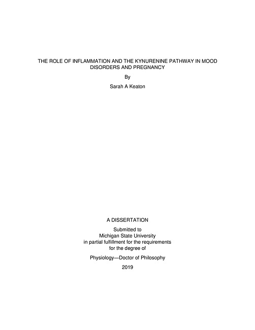 "Inflammation and the kynurenine pathway are involved in multiple physiological and pathophysiological states, however their role in depression during and after pregnancy, suicidality, and pre-eclampsia remain to be understood. Here, we sought to understand how the kynurenine pathway and its metabolites as well as their interactions with inflammation may influence these conditions. First, we analyzed suicide warning in women with mood and anxiety disorders. We identified a distinct immunobiological profile linked to cross-diagnostic suicide risk in women with mood disorders, attending a psychiatric outpatient clinic. This consisted of a strong proinflammatory profile, containing white blood cell count and polymononuclear leukocyte cell count which may be associated with the underlying pathobiology of suicide warning.. Next, we analyzed inflammation and the kynurenine pathway in peripartum depression and postpartum depression and suicidality to understand how they could influence psychiatric health. We found plasma IL-6 predicted depression scores throughout the first, second, and third trimester. In the third trimester we found increased neurotoxic kynurenine metabolite quinolinic acid in the plasma of women with depression compared to health controls. Additionally, we found plasma IL-1beta and IL-6 correlated with placental tissue expression of indolamine 2,3-dioxygenase 1 (IDO) connecting the placenta with peripheral inflammation in the plasma. There was a different inflammatory profile in postpartum depression and suicidality, with increased IL-8 and decreased IL-2, indicating the mechanisms causing peripartum depression and postpartum depression may be different. Finally, we looked at placentas from women with pre-eclampsia compared to healthy controls and found they had dysregulated tryptophan metabolism. There was a decrease of IDO, a compensatory increase in expression of tryptophan-2,3-dioxygenase, and this was associated with a decrease of serum amyloid A. Collectively, this dissertation highlights the importance of inflammation and the kynurenine pathway in the pathophysiology of psychiatric disorders and pregnancy states in females. Further research of inflammation and the kynurenine pathway may lead to screening panels and treatments for suicide, peripartum depression, postpartum depression and suicidality, and pre-eclampsia."--Pages ii-iii.