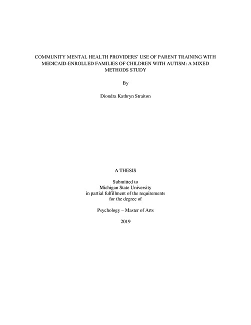 "Parent training, in which providers train parents to address their child's maladaptive behavior or skill development, is an underutilized evidenced-based treatment for autism spectrum disorder (ASD). This mixed methods project examined the use of parent training as part of the Michigan Medicaid Autism Benefit, which covers applied behavior analysis (ABA) services for Medicaid-enrolled children with ASD under age 21 in Michigan. Descriptive statistics and multiple regression were used to analyze Medicaid claims data for 879 children and survey data from 97 ABA providers who service Medicaid-enrolled children with ASD. Content analysis was used to analyze open-ended survey items and phenomenological analysis was used to analyze interviews from a subset of 13 providers. Results demonstrated that: a) frequency of parent training encounters was very low, with evidence to suggest that Hispanic/Latino children receive fewer encounters; b) ABA providers' conceptualization of parent training is inconsistent with the literature; c) providers report using evidence-based parent training strategies at a moderate-to-high level on the survey, but infrequently mention strategies in interviews; d) providers use sessions for other purposes; e) providers report having limited related training; f) providers report numerous barriers and facilitators which are related to their reported extensiveness of parent training; and g) parent training and family-centered care are significantly related. Implications for increasing use of parent training for this population are discussed."--Page ii.