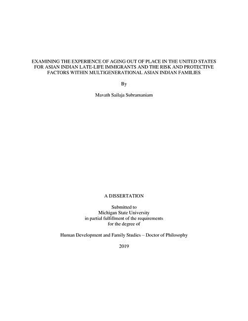 "Most Asian Indian older immigrants who settle in this country after the age of 60 are sponsored by their adult children under The Family Reunification Act of 1990, which offered many naturalized and legal immigrants the opportunity to encourage their parents to relocate to the United States (U.S.). The primary reasons that late-life immigrants relocate to the U.S., are to assist their adult children with childcare or to facilitate caregiving. They are often a vulnerable population due to limited English language proficiency, little or no U.S. work experience and weak ties to social institutions. Among Asian Indians, there is greater reliance on families who play a crucial role in the health and well-being of older adults. Using an integrated framework incorporating aspects of Acculturation theory with the Relational and Resilience Theory of Ethnic Family Resilience, this qualitative study focuses on the unique challenges of aging out of place in the immigrant context, in addition to highlighting the concomitant challenges faced by the families in adjusting to multigenerational living arrangements and intergenerational relationships. A total of 20 participants from 8 Asian Indian families residing in the United States, were interviewed using qualitative in-depth interviews. The participants consisted of 9 late-life parents aged 70 to 89 who relocated to the U.S., between 5 to 20 years ago, 8 adult children with whom the parents reside and 3 spouses. Data were analyzed using a thematic analysis protocol. The findings suggest that late-life immigrants can adapt to U.S. culture with the support of their families and with the addition of community involvement. Positive relationships with children and grandchildren support this acculturation process and provide a route to adaptation for older adults that also contribute to family well-being. The reciprocity of benefits for older adults and their families also enhances the intergenerational aspects of family resilience. Research findings will contribute to the development of a resilience framework that will help inform effective assessments and intervention strategies, for clinicians and other helping professionals, in their efforts to identify key family processes that cultivate, develop, and nurture family system resilience in immigrant families."--Pages ii-iii.