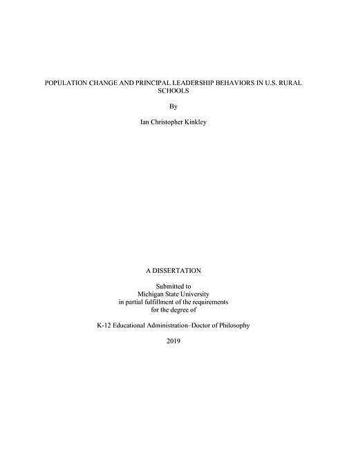 "This dissertation study seeks to explore the intersection of rurality with educational leadership through the phenomena of population change. The study is comprised of three distinct papers, which explore this intersection in complementary ways: examining broad trends in rural public school student populations; exploring the experiences and perceptions of principals and school leaders in rural schools that have undergone changes in student population; and exploring how principals perceive the influence of state policies and climate, in addition to population change and their rural contexts, as on their leadership behaviors and functions of their schools. The collective findings from these three papers are suggestive of changing leadership behaviors and duties for school leaders as rural schools continue to decline in enrollment across much of the United States. These changes in leadership are further complicated by local contexts and state policies. Even with a majority of the public school districts in the United States located in these rural areas (NCES, n.d.), only a scant corpus of educational research focuses on these schools. Thus, the unique contexts and interests of these schools and communities may not be fully understood, which carries implications for the preparation of leaders for positions in rural schools and the design of educational policy."--Page ii.