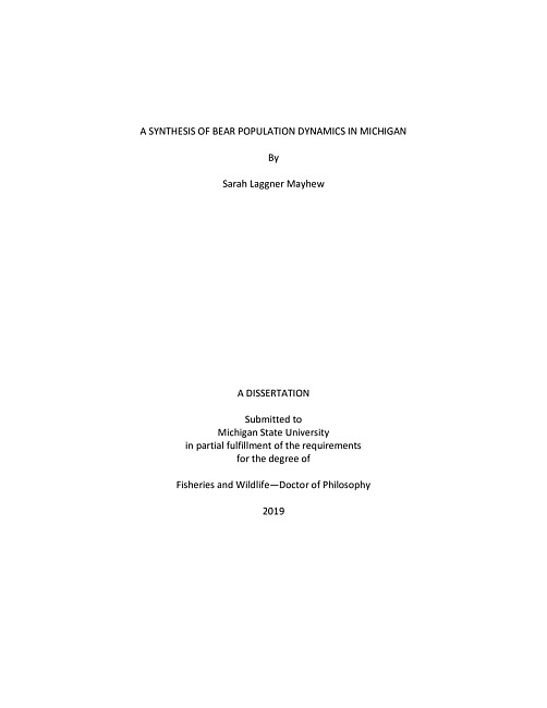 "The Michigan Department of Natural Resources (DNR) manages the black bear (Ursus americanus) population of Michigan primarily through manipulating the harvest by adjusting the quota of hunting licenses. Estimates of the bear population play a key role in determining the appropriate license quota to achieve the DNR's bear population objectives. Past population estimates were unreliable or infrequent, so we developed a statistical catch-at-age analysis (SCAA) of the Upper Peninsula (UP) and northern Lower Peninsula (NLP) bear populations of Michigan from 1992-2015 to inform the bear management program and to allow the DNR to more closely monitor changes in the bear population over time. To support the models, we estimated the aging and sexing error rates of harvested Michigan black bears. We estimated aging error by comparing the true age of known-age bears to the age determined through cementum annuli aging techniques. Aging error rates were low (2%) at the lowest age categories and increased as bear age increased. We also estimated the sexing error rates by comparing the genetic sex of harvested bears to the sex hunters reported at the time of harvest. Sexing error was higher for females than males and differed by region. The error rates we estimated, however, were unlikely to have major effects on analyses based on sex and age data unless those data were heavily skewed toward one sex and the sexes exhibited large differences in age distribution. We also described the reproductive patterns of Michigan black bears and looked for reproductive trends over age, time and geographic region. Results showed differences between the UP and NLP. Adult females in the UP began breeding at an older age than those in the NLP and had smaller litters. By 4 years old, however, the proportion of females that bred each year was approximately 50% in each region, with only occasional major fluctuations, likely due to catastrophic mast failures. Overall, the Michigan black bear populations are as or more productive than other black bear populations in eastern North America. We developed the SCAA models for both the UP and NLP regions of Michigan to monitor the black bear population and to support the DNR's need to assess effects of past management and support decisions on future management actions. Within each region, the final selected models showed a stable to slightly increasing bear population in the UP and an increasing population in the NLP from 1992 to 2015. Model evaluation raised no major concerns of model behavior. Sensitivity analysis showed the models to be insensitive to simplifying assumptions and available data, except for the availability of mark-recapture population estimates. We recommend the DNR continue to estimate the bear populations through independent mark-recapture surveys or other means every 5 years. The SCAA models provide evidence of a stable bear population in the UP and an increasing population in the NLP. The bear populations' high annual mortality rates are offset by high fecundity."--Pages ii-iii.