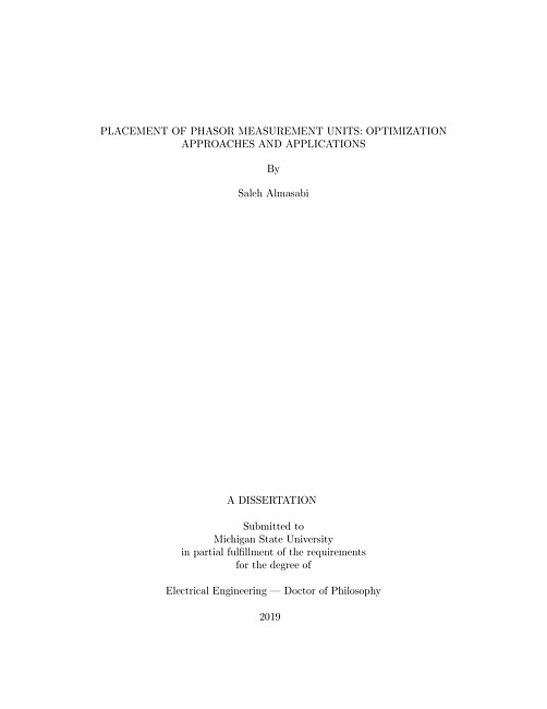 "Phasor measurement units (PMUs) provide measurements with high precision at a high resolution (up to 50 samples per second). These measurements are synchronized and time-stamped using the Global Positioning System. Despite these advantages, the industry has been slow in adopting PMU technology due to the high cost of installing PMUs. Therefore, PMU locations must be judiciously selected through optimal placement of PMUs (OPP), which enables the minimization of installation cost. This dissertation examines the OPP problem from several perspectives. First, the OPP problem definition is re-examined since most OPP literature associates the PMU installation cost with the PMU unit. Most techniques in the literature have proposed to minimize the number of PMUs while considering the complete observability of the system. However, PMUs require sufficient infrastructure to be in place before they can perform most of their intended functions. Therefore, the OPP problem should be reformulated to include the supporting infrastructure of PMUs. The proposed OPP formulation is implemented by using a bi-level framework. This framework can accommodate different varieties of OPP, such as single-stage, multistage, and application-based approaches. Moreover, the proposed framework achieves the optimal solution with the maximum observability in the case of multiple optima. Second, this dissertation examines application-based OPP approaches, where specific technical benefits are prioritized over the cost of the OPP. Three applications are proposed. The first application is a fault-tolerance based OPP approach, where the network fault-tolerance is enhanced by deploying PMUs to the vulnerable elements in the network. In the second application, a voltage stability criterion is developed and proposed, where the critical buses are identified and prioritized for PMU allocation. The third application addresses false data injection attacks (FDIAs), where the system topology is used by the adversary to bypass the bad data detection of state estimators. The proposed OPP approach enhances bad data detection against FDIAs by utilizing the PMUs as authenticators for each other."--Pages ii-iii.