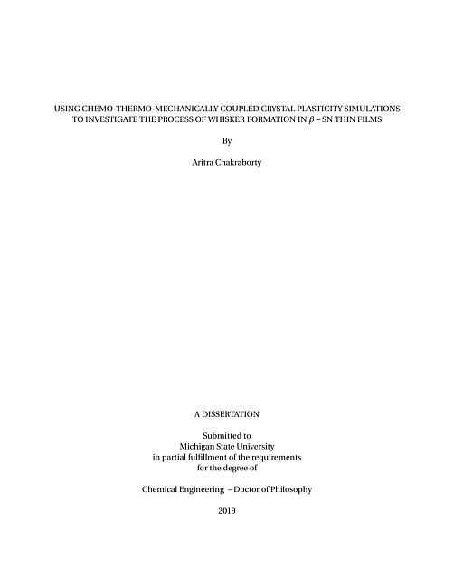 "beta-Sn (Sn) whiskers growing from tin coatings in electronic devices have been a serious concern to its reliability as they nucleate in unpredictable locations, can grow to a length of several millimeters, and hence, are able to short-circuit different parts of an electronic assembly. It was found that alloying Sn with lead (Pb) mitigated whisker formation. However, with the drive to- wards lead-free electronics from early 2000, due to the hazardous nature of Pb, reliability problems due to tin whiskers resurfaced, thereby, rekindling an interest to understand their governing mechanisms in order to propose efficient mitigation strategies. With such a drive, significant research has been published highlighting different whisker characteristics (morphology, propensity, and kinetics). However, till date, there lacks a unified theory that could explain the formation of these filamentous structures, with sometimes even contradicting observations between different research groups. Despite some contradictions, it is widely accepted that tin whiskers are a result of stress-driven diffusion in the film, with diffusion occurring primarily through the grain boundary network. Stresses in these films can originate from various sources, such as, upon deposition, indentation, thermal expansion mismatch, and by formation of voluminous Cu6Sn5 intermetallic compounds at the interface between a copper substrate and the film. Among these sources, thermal straining has been used to deliberately control the stresses in films deposited on a Silicon (Si) substrate (having a lower thermal expansion coefficient thanbeta-Sn) to analyze the effect of applied stress on whisker propensity. In the present work such experimental conditions of thermally straining beta-Sn films is mimicked, and the resulting mechanics and kinetics are investigated using fully coupled chemo- thermo-mechanical simulations in a crystal plasticity continuum mechanical framework. The goal of the is to identify crystallographic and geometric factors that modulate the stress-driven transport of atoms along the grain boundary network. In that regard, first a thermo-mechanical study is done that highlights the dominating influence of global film-texture compared to grain geometry and grain-size distribution. It is also established that whisker nucleation is indeed a local phenomenon as no long-range stress gradients are found. Following, more involved chemo-thermo-mechanical simulations are performed to understand the kinematics and kinetics of atom redistribution in these thermally strained films for two loading conditions. Based on these simulations it is inferred that plastic relaxation plays a dominant role in stress evolution compared to diffusion kinetics. The dominant role of film-texture on determining whisker nucleation sites (low compressive locations in the biaxially strained film) can be attributed to the high anisotropy of the body-centered tetragonal beta-Sn crystal structure that involves an elastic anisotropy, a thermal anisotropy, and a very complex plastic anisotropy. The complex plastic anisotropy arises due to the availability of multiple slip families with a small number of slip systems per family. Plasticity readily happens in Sn even at room temperature, which corresponds to about 0.6 T m, and, therefore, requires the establishment of an accurate constitutive description. In that regard, the second half of this work focuses on establishing the reliability of Inverse Indentation Analysis (IIA) as a means to identify such constitutive plastic parameters for different crystal structures. In this method, the error in experimental and simulated indentation response (both in load--displacement and surface topography) is minimized to obtain the constitutive material parameters. The reliability of this IIA method is first established for face-centered cubic (fcc) materials, where it is found that any crystal orientation is adequately sensitive for the optimization to identify the parameters. Such is not the case for less symmetric hexagonal materials, where the efficacy of the IIA method relies heavily on the selected crystal orientation, and it is proposed to select crystal orientations that are sensitive to all slip families considered in the constitutive description. The next step will be to apply the IIA method to beta-Sn."--Pages ii-iii.